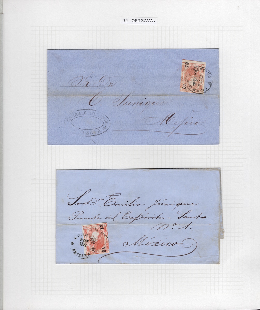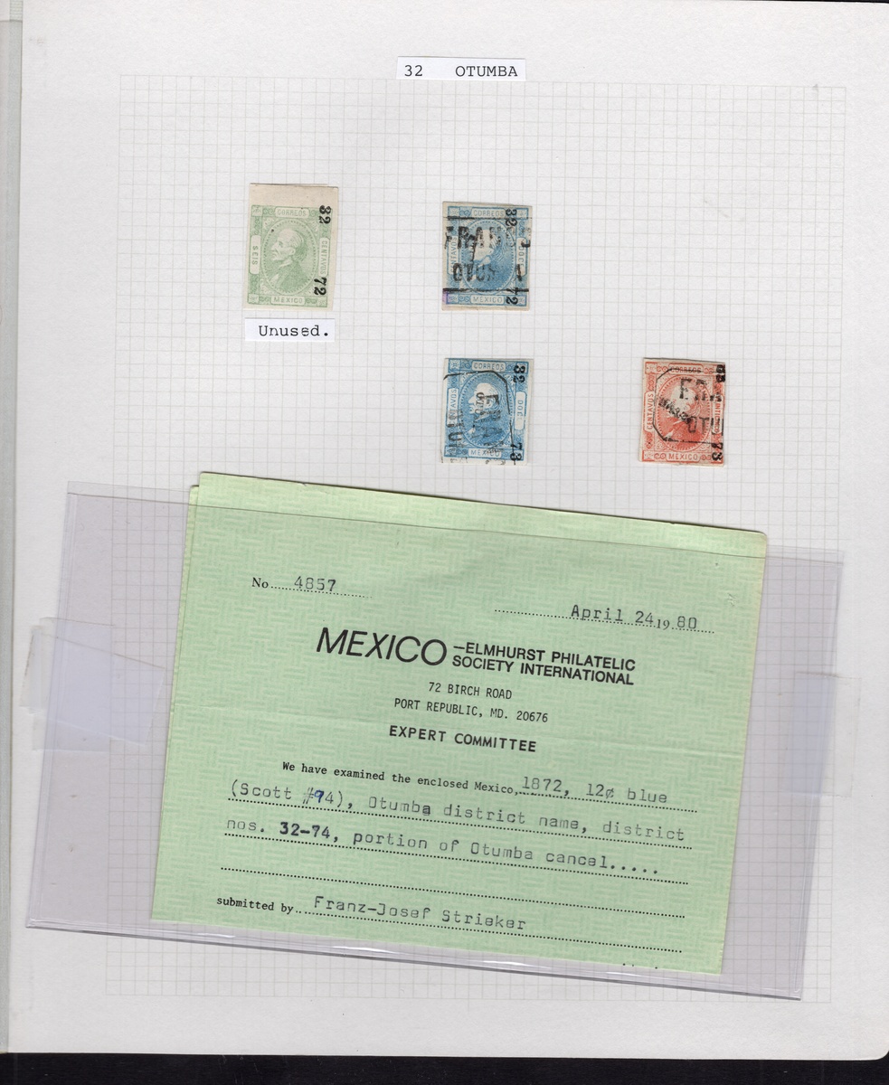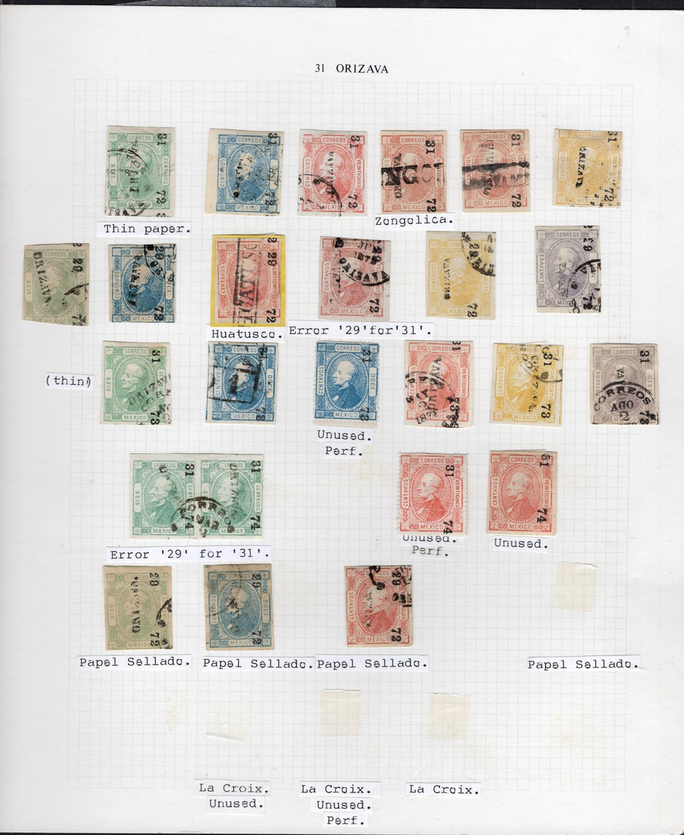 301 Used   imageMexico. 1872 "Hidalgos". Orizava, Otumba Group of 31 stamps, all but one are imperforate, mostly used, and two 25c. Red covers, neatly mounted on presentation pages (consignments #31 and #32), with different consignment years 1872-74 each in a row, with no duplication, including denominations from 6c. to 100c., as well as three stamps with the "Papel Sellado" watermark. Cancels include Zongolica, Orizaba, Huatusco, and Otumba. One of the highlights is a beautiful 12c. Blue, canceled in Otumba, accompanied by a 1980 MEPSI certificate. The collection also includes the consignment error "29" instead of "31". Very fine for the most part, with many stamps having three or four clear margins. Scott 81-83, 93-96, 98; NF and Scott (for watermarked stamps) is $1,531., , (Image) (Image2) (Image3) (Image4) (Image5) (Image6) (All Images)