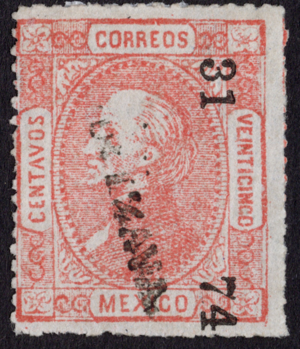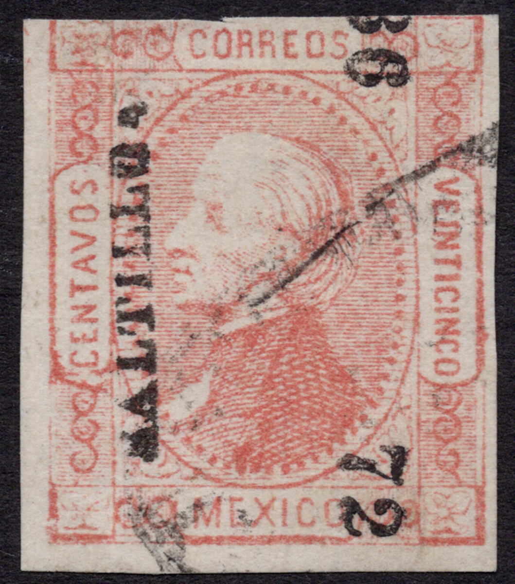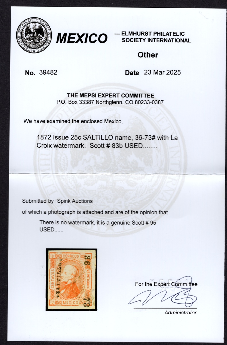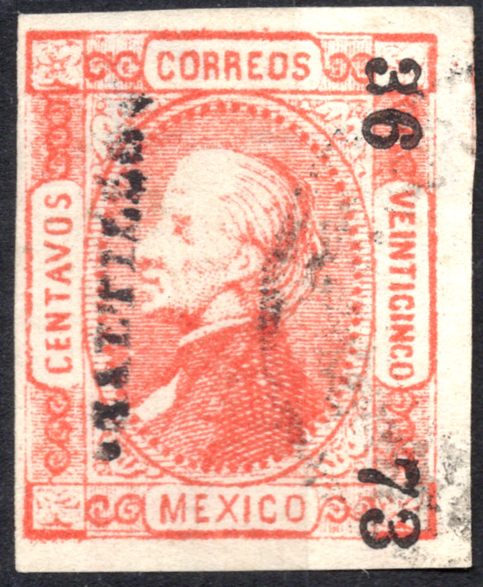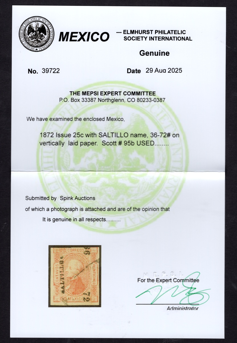 317 Used   imageMexico. 1872 "Hidalgos". Saltillo 25c. Red (#36-72) on vertically laid paper, cut into at top, otherwise good margins, used. 2025 MEPSI certificate. Scott 95b, $500. (Image) (Image2) (All Images)