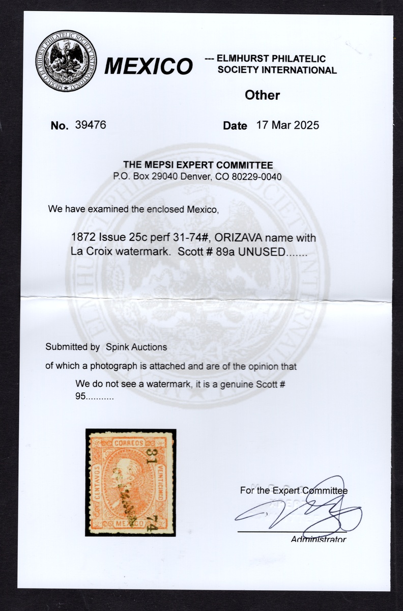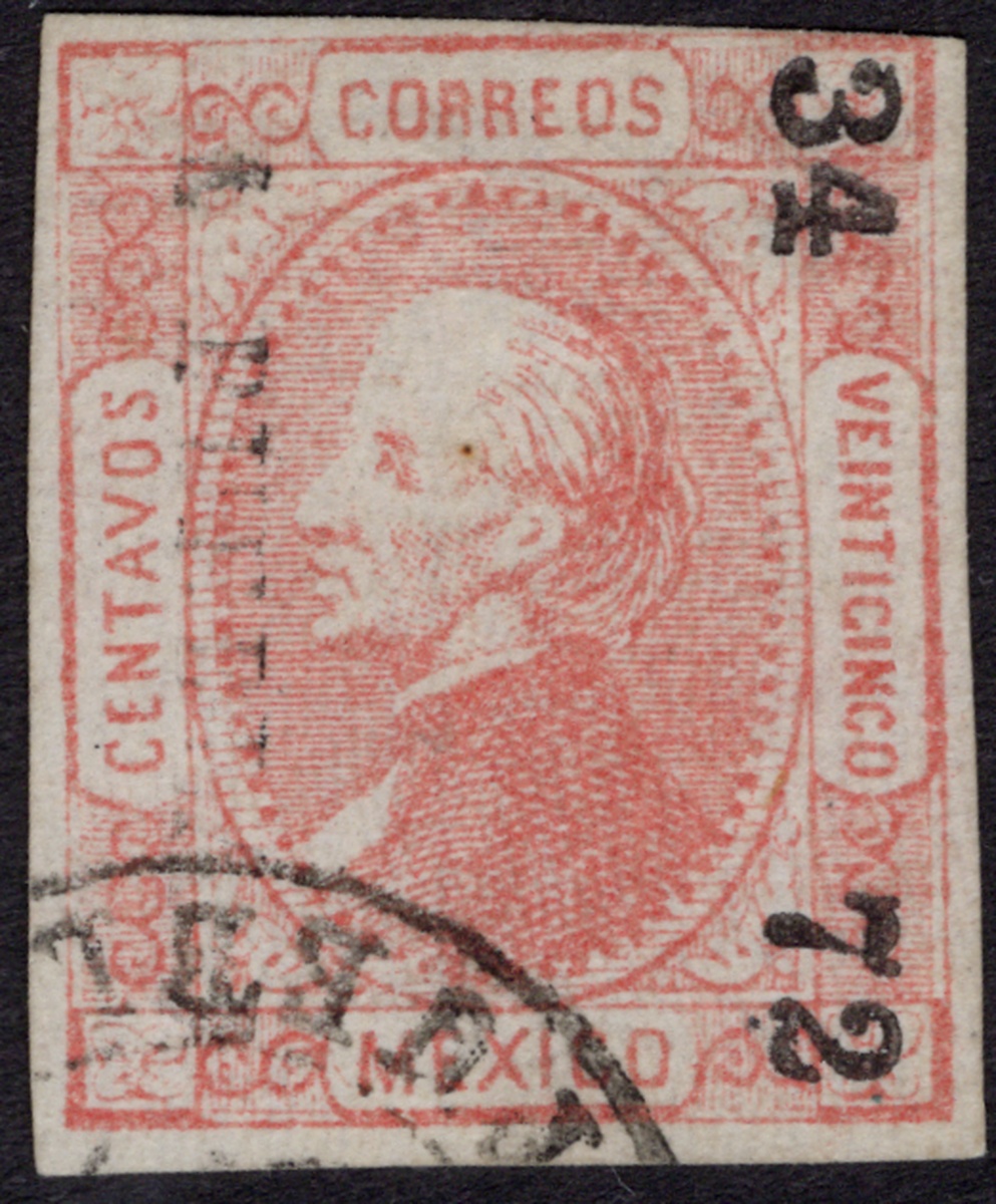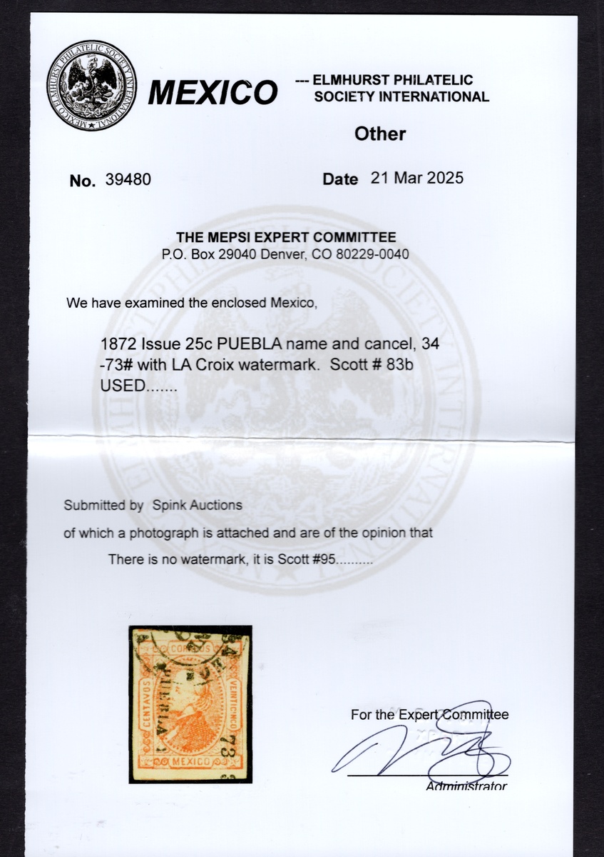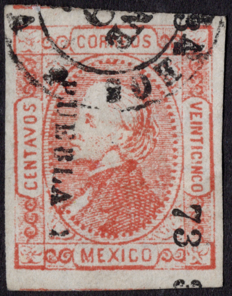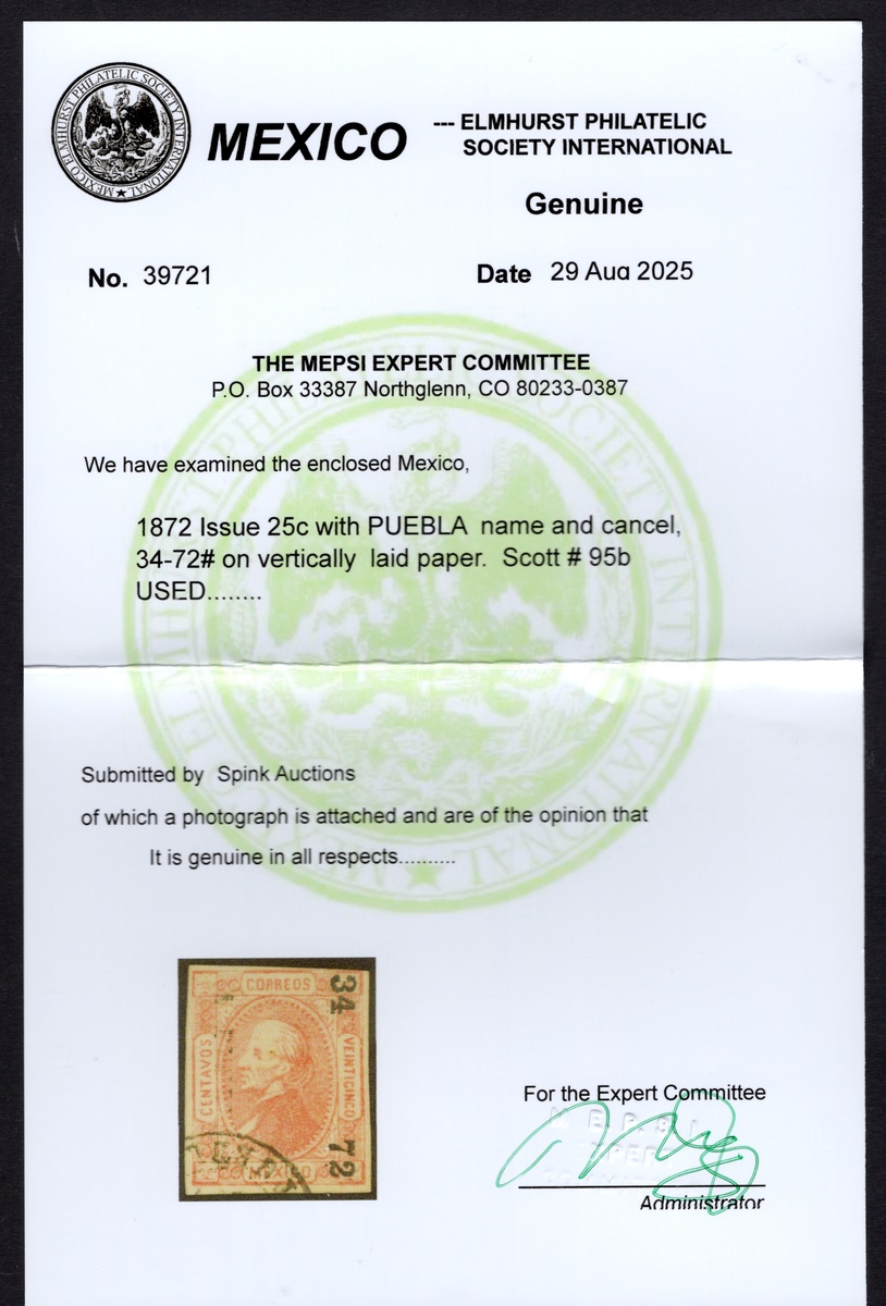 309 Used   imageMexico. 1872 "Hidalgos". Puebla 25c. Red (#34-72) on vertically laid paper, full margins all around, used. 2025 MEPSI certificate. Scott 95b, $500. (Image) (Image2) (All Images)