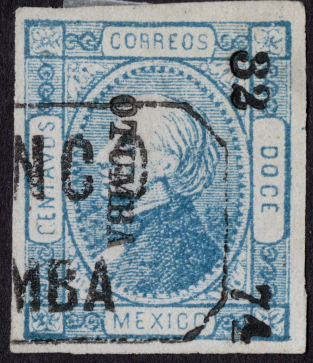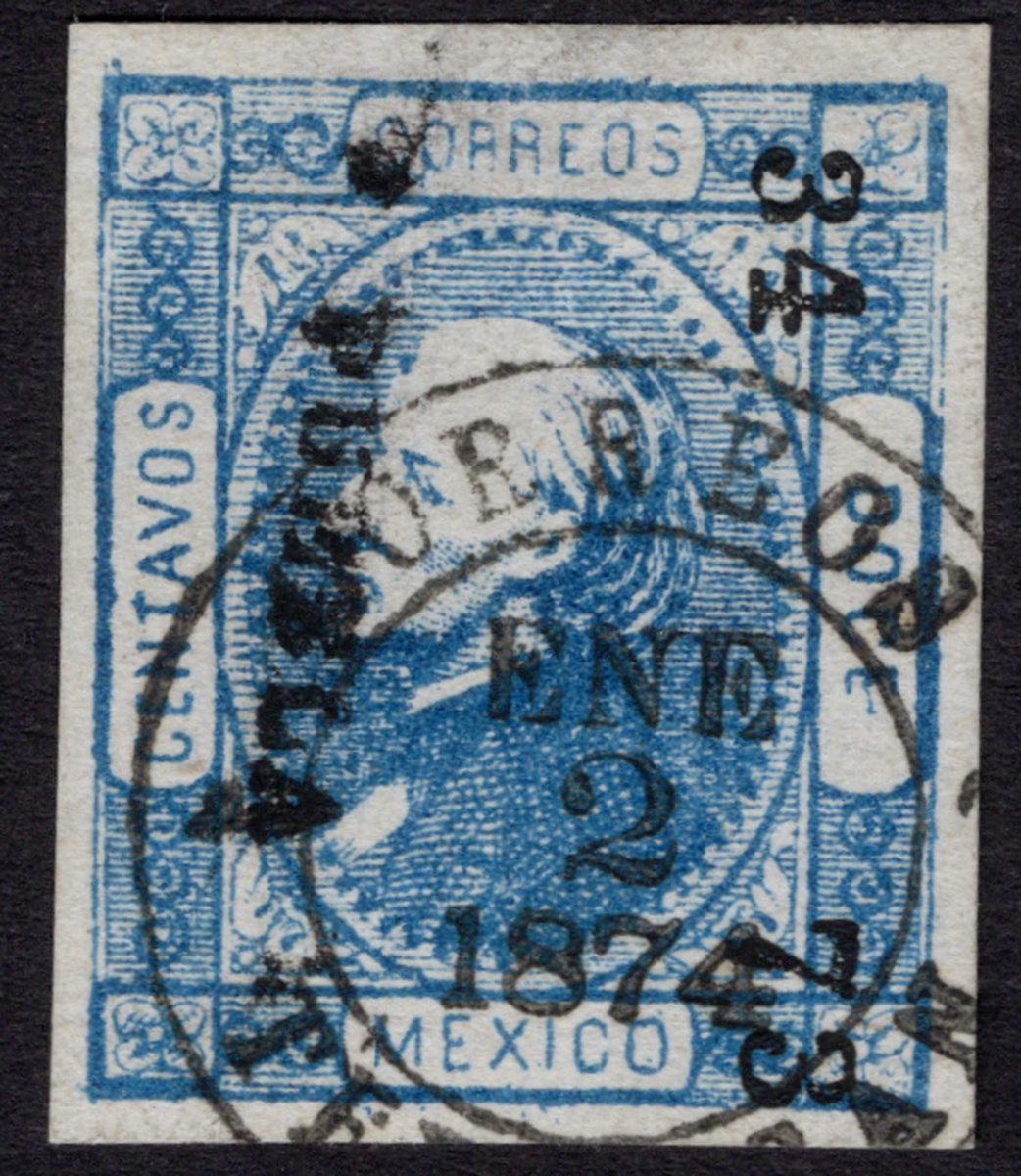 308 Used   imageMexico. 1872 "Hidalgos". Puebla 12c. Blue (#34-73) imperforate, "La Croix Frères" watermark, good margins all around, used with c.d.s. Scott 82b, $325. (Image)