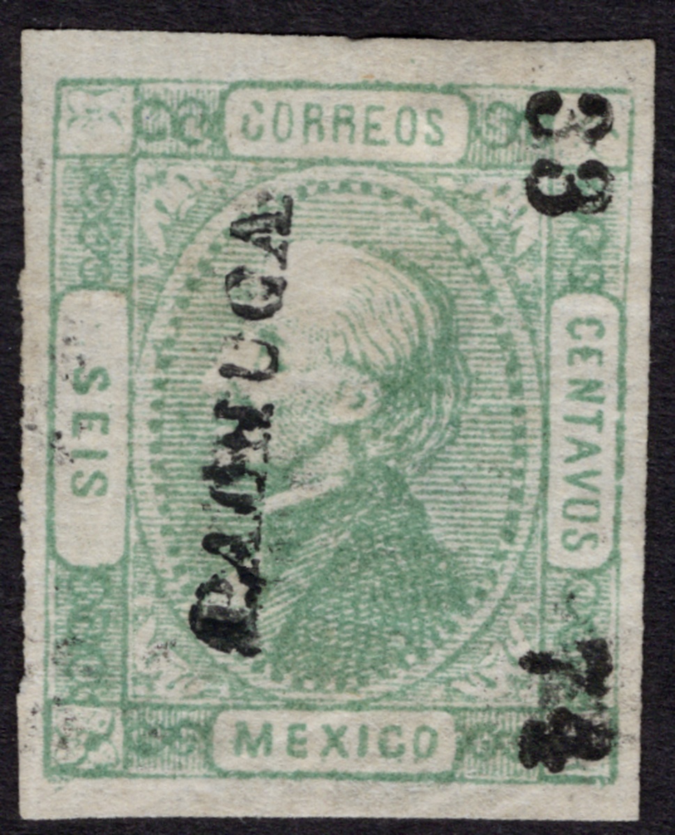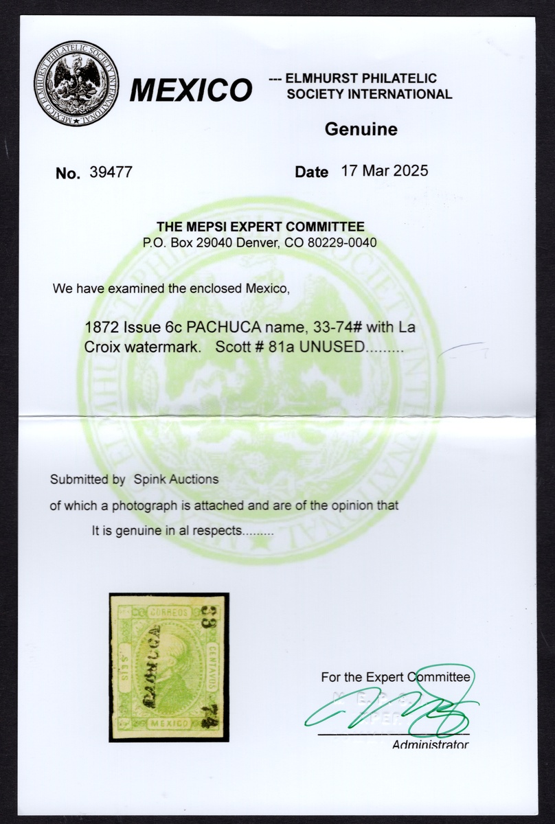 302   imageMexico. 1872 "Hidalgos". Pachuca 6c.Green (#33-1874), unused imperforate with "La Croix Frères" watermark, good margins all around and o.g. 2025 MEPSI certificate. Scott 81a, $ 2,000. (Image) (Image2) (All Images)