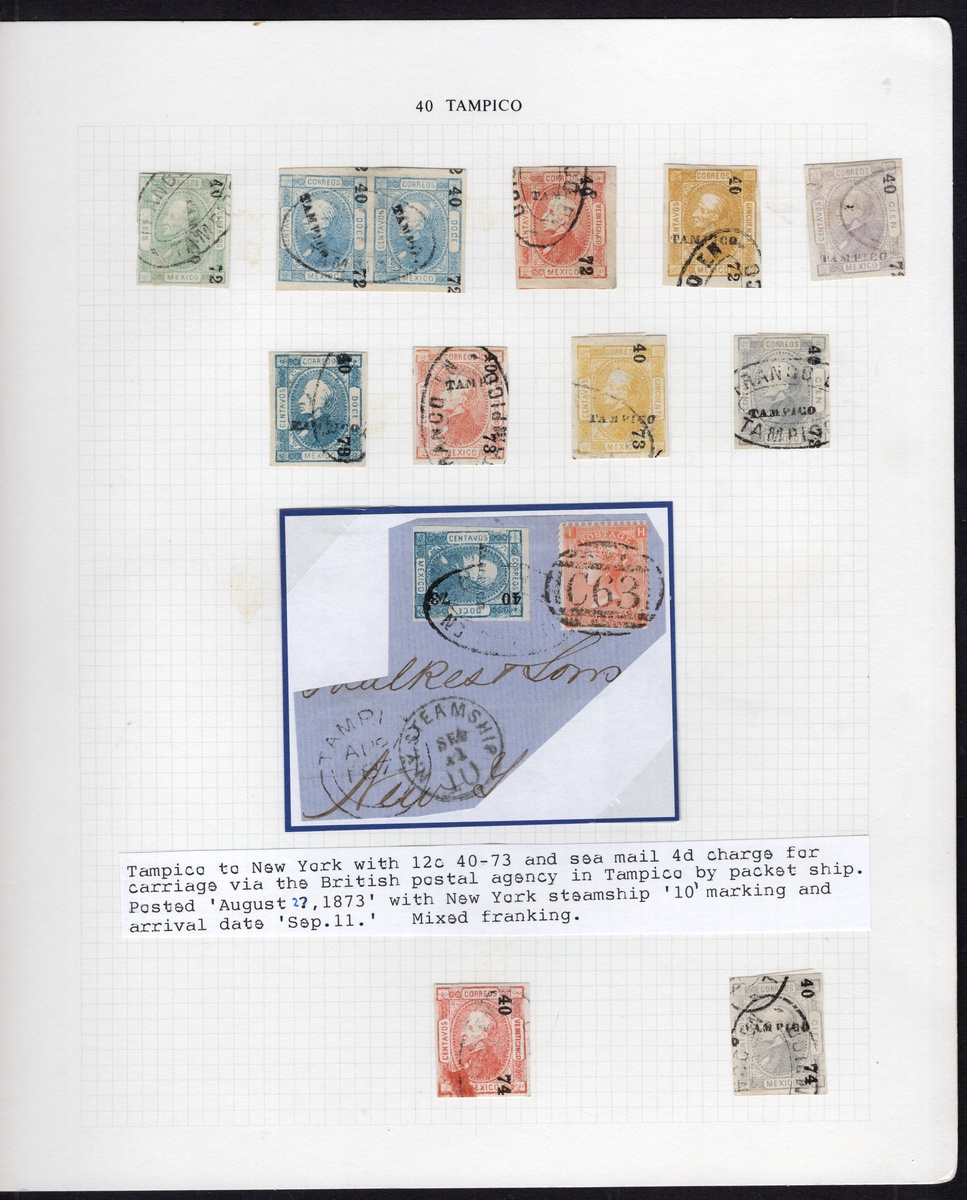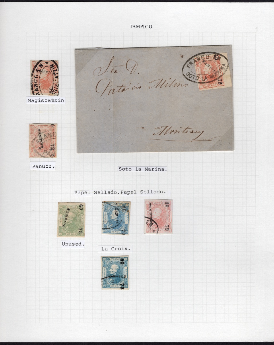 303 Used   imageMexico. 1872 "Hidalgos". Pachuca, Tampico Assembly comprising 33 stamps (two are perforated), mostly used, along with a 25c. Red on cover, neatly mounted on presentation pages (consignments #33 and #34), with different consignment years 1872-74 each in a row, with no duplication, including one piece to New York, featuring a British stamp posted at the British agency in Tampico. The cover is particularly attractive and scarce, featuring a perfectly struck Soto La Marina cancel. The stamps include denominations from 6c. to 100c., as well as eight stamps with the "Papel Sellado" watermark. Cancellations include Tampico, Soto la Marina, Metzilcatzin, Pánuco, Mineral del Monte, and Mazatlán. Generally very fine and with good margins. Scott 81-83, 82b, 93-96, 98, 100, 101; NF and Scott (for watermarked stamps) is $2,276., , , (Image) (Image2) (Image3) (All Images)