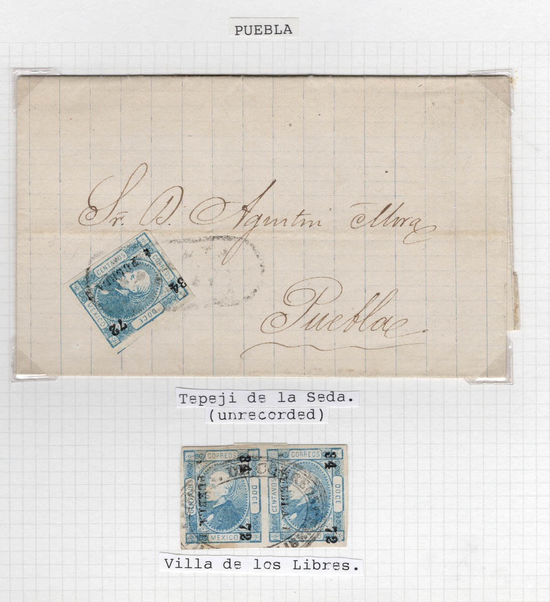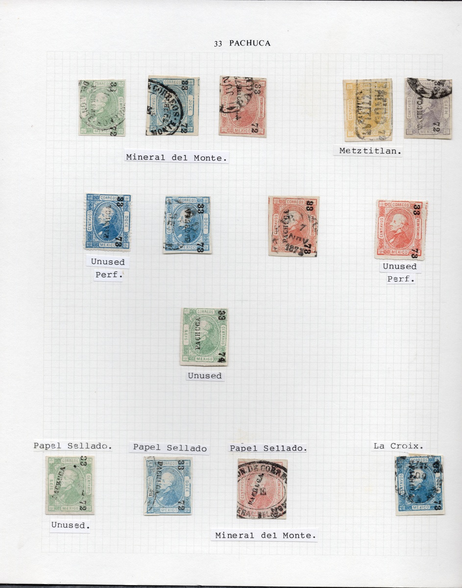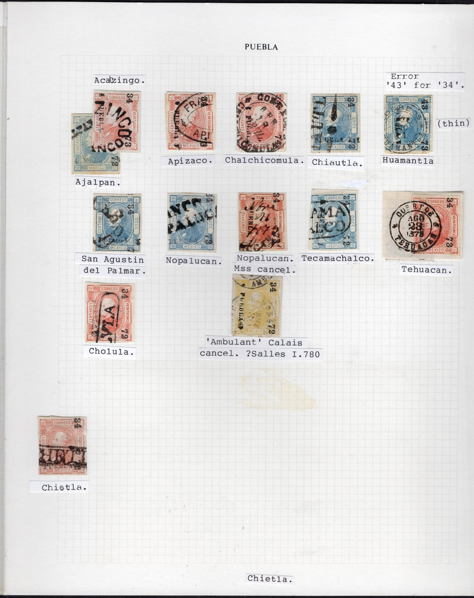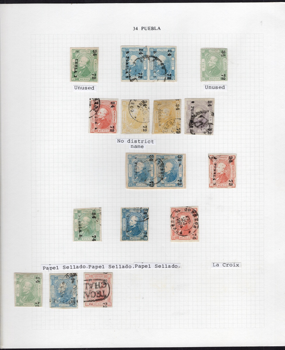 307 Used   imageMexico. 1872 "Hidalgos". Puebla Assembly comprising 34 imperforate stamps, mostly used, as well as three covers, neatly mounted on presentation pages (consignment #34), with no duplication. Two of the covers feature a 25c. Red, and one cover has a 12c. Blue, faintly canceled in Tepeji de la Seda. The stamps include denominations from 6c. to 100c., as well as three stamps with the "Papel Sellado" watermark. Cancellations include numerous small towns such as Acatzingo, Ajalpan, Apizaco, Chalchicomula, Chiautla, Huamantla, El Palmar, Nopalucan, Tecamachalco, Tehuacán, Cholula, Chietla, Los Libres, and Tepeji de la Seda. There is one 2025 MEPSI certificate. Scott 81-83, 93-96, 98; NF and Scott (for watermarked stamps) is $730., , (Image) (Image2) (Image3) (Image4) (Image5) (Image6) (All Images)