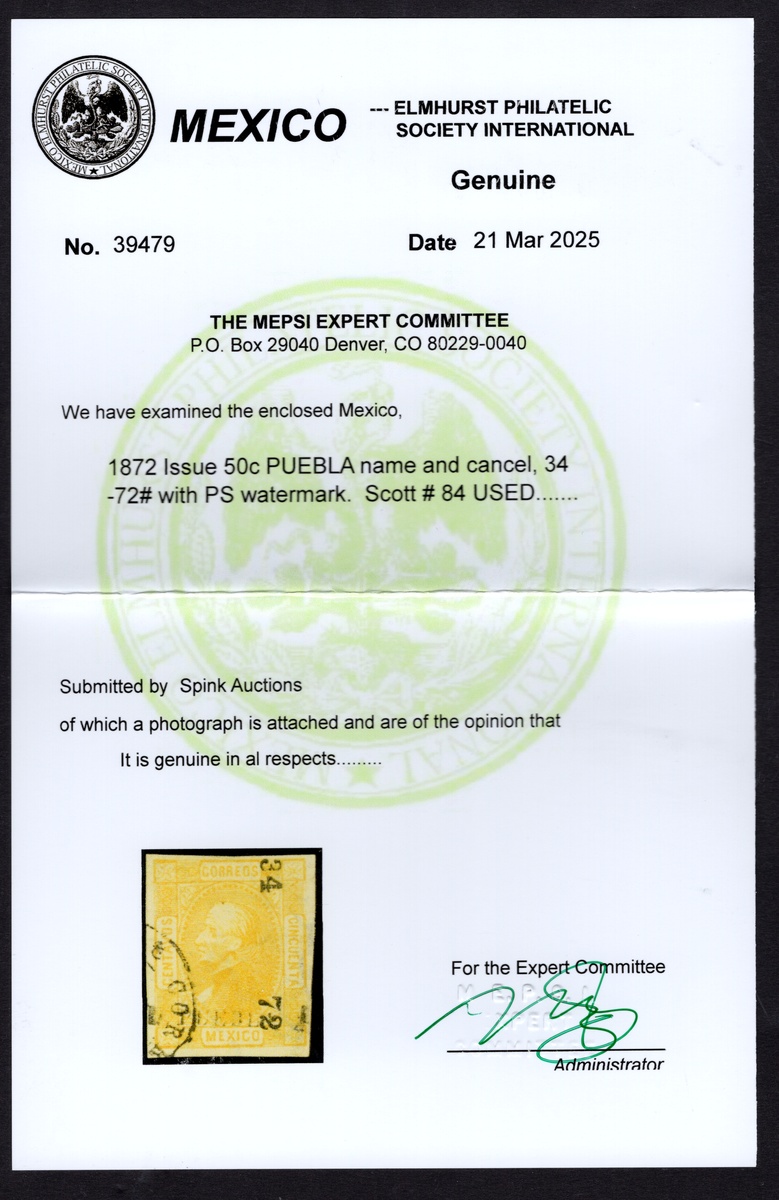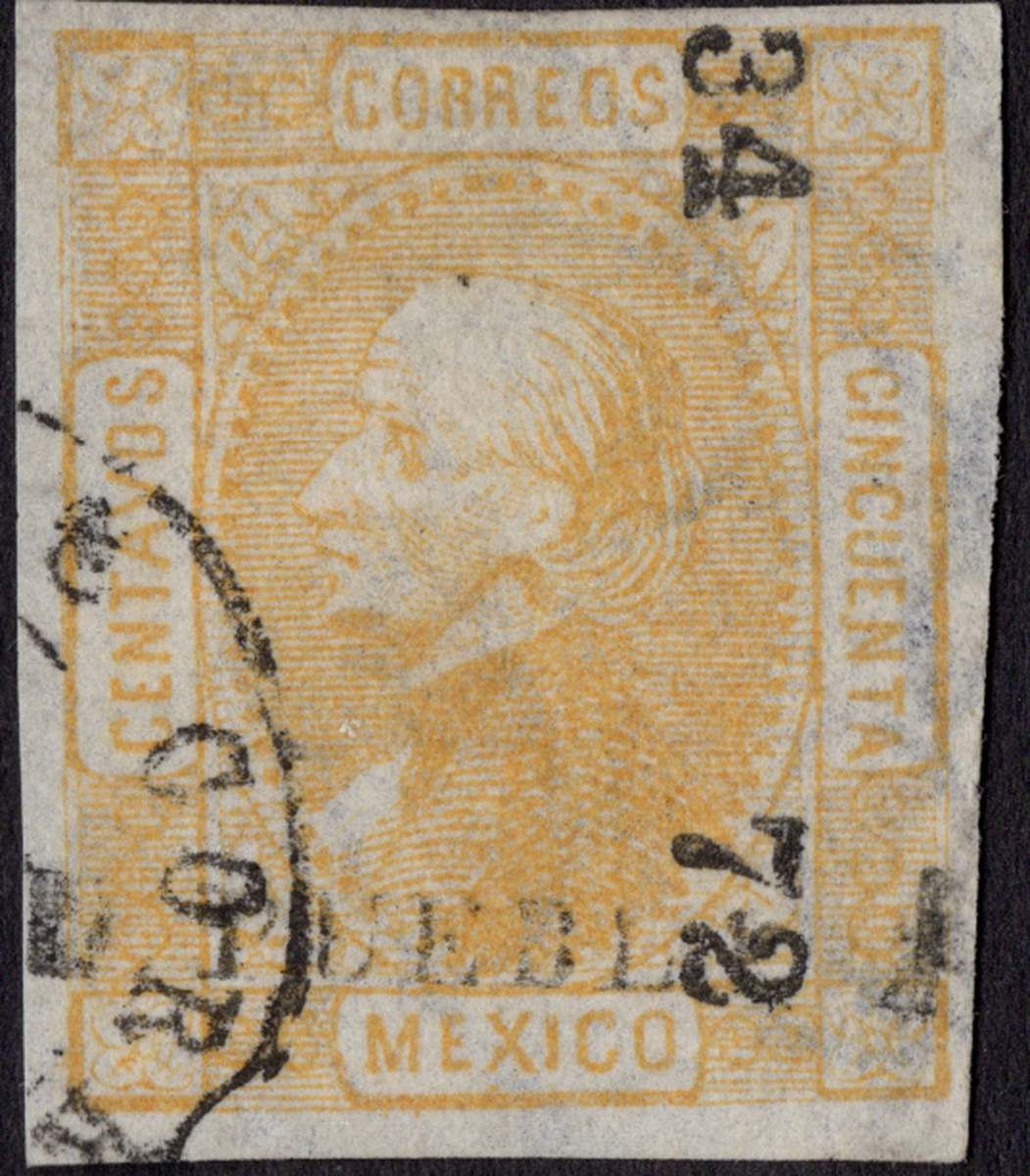 304 Used   imageMexico. 1872 "Hidalgos". Puebla 50c. Yellow, imperforate used (#34-72) with "Papel Sellado" watermark and margins all around. 2025 MEPSI certificate. Scott 84, $850. (Image) (Image2) (All Images)