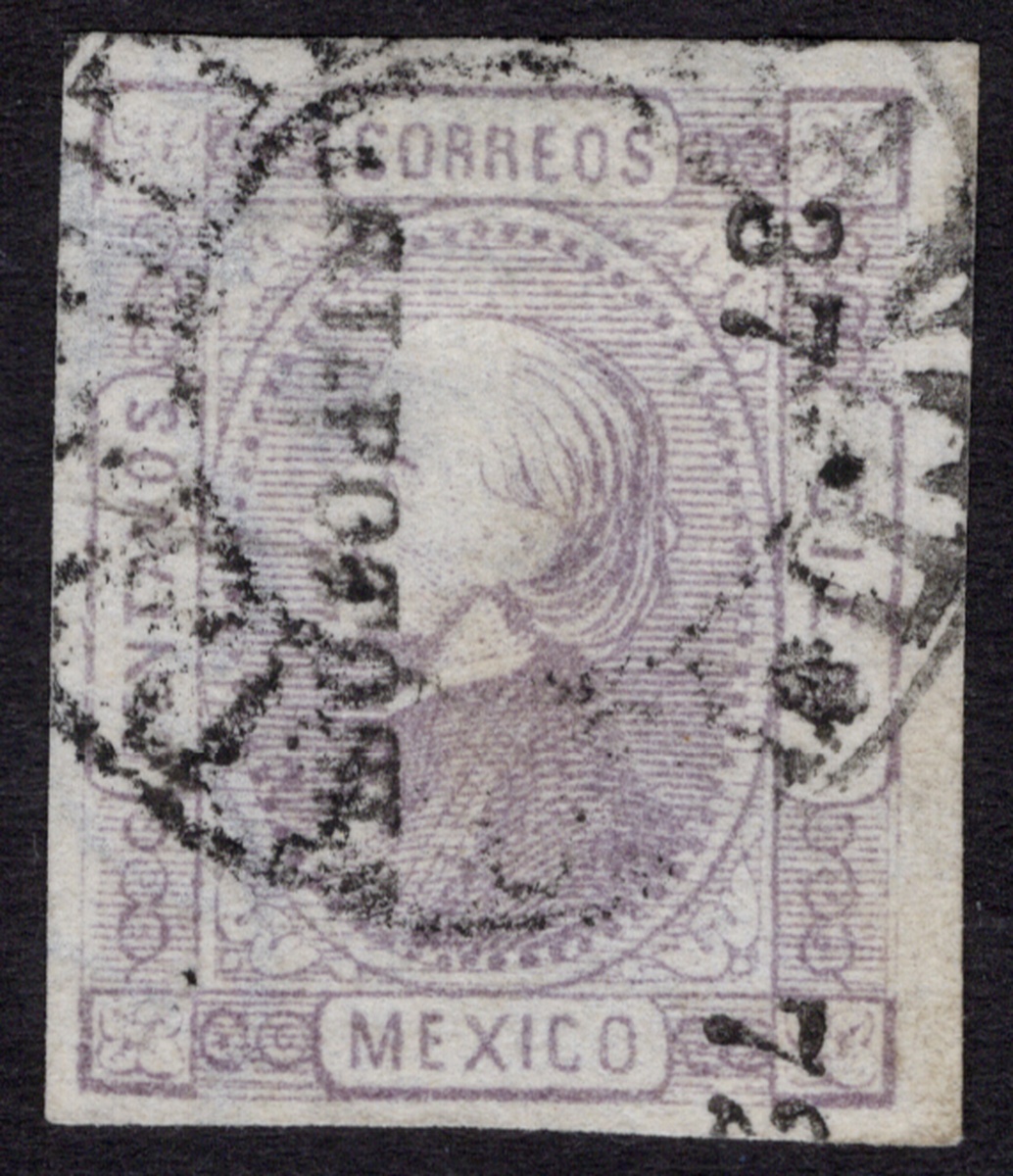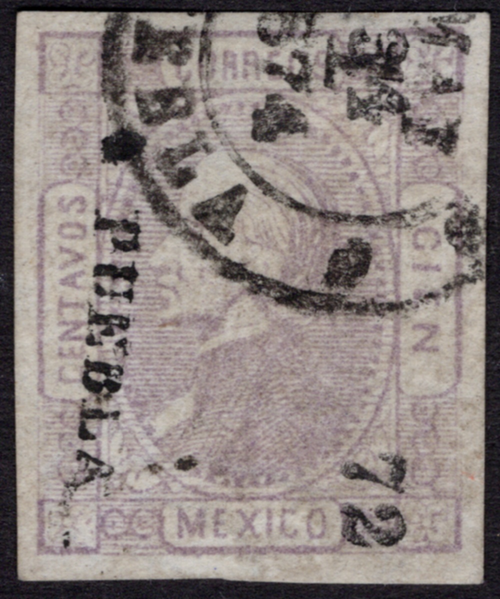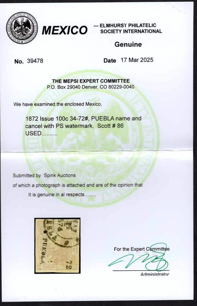 305 Used   imageMexico. 1872 "Hidalgos". Puebla 100c. Gray Lilac (#34-72), imperforate used with c.d.s. "Papel Sellado" watermark, margins all around. 2025 MEPSI certificate. Scott 86, $650. (Image) (Image2) (All Images)
