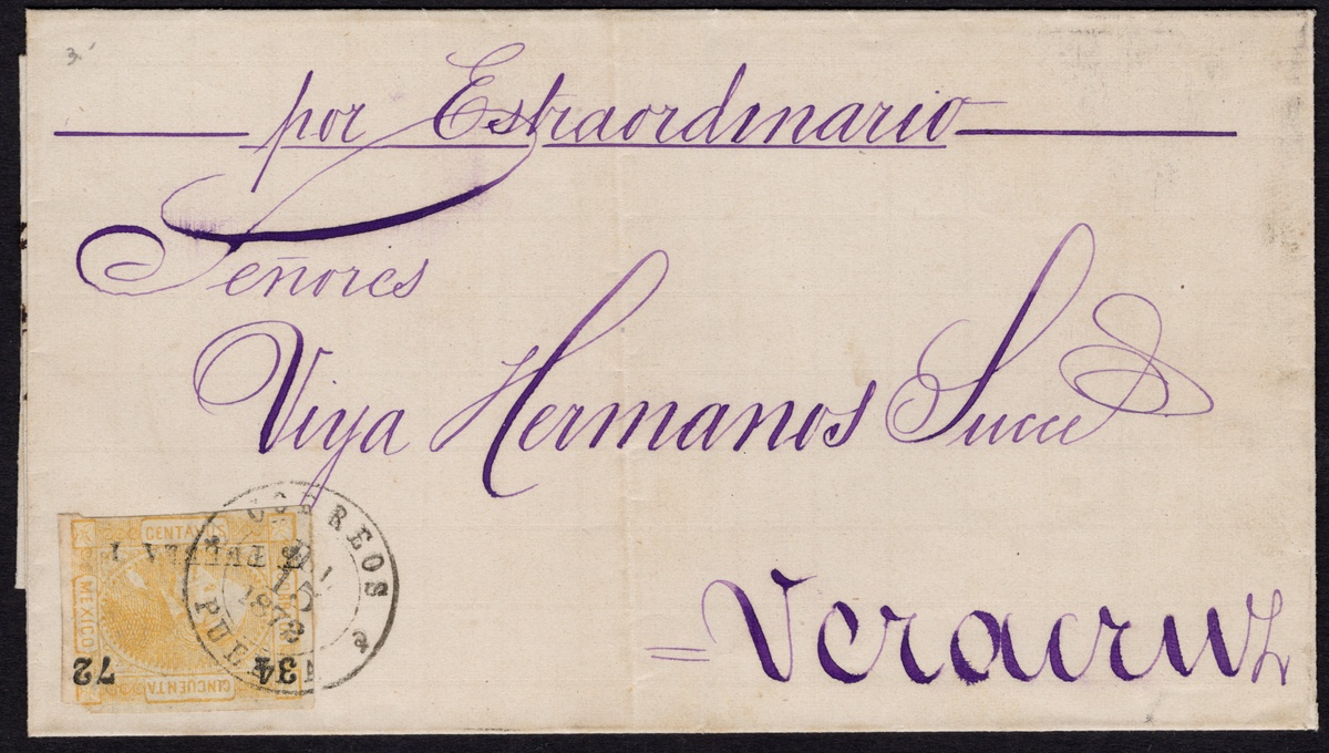 306   imageMexico. 1872 "Hidalgos". Puebla 50c. Yellow (#34-72), imperforate on very attractive entire letter from Puebla to Veracruz dated July 15, 1872, tied by c.d.s. The cover paid the "Extraordinario" double rate for express service, and is beautifully addressed with blue ink. Filing crease not affecting the stamp, which has three margins, one close at left with a nick on the bottom right corner. An exhibition item. Scott 96. (Image)