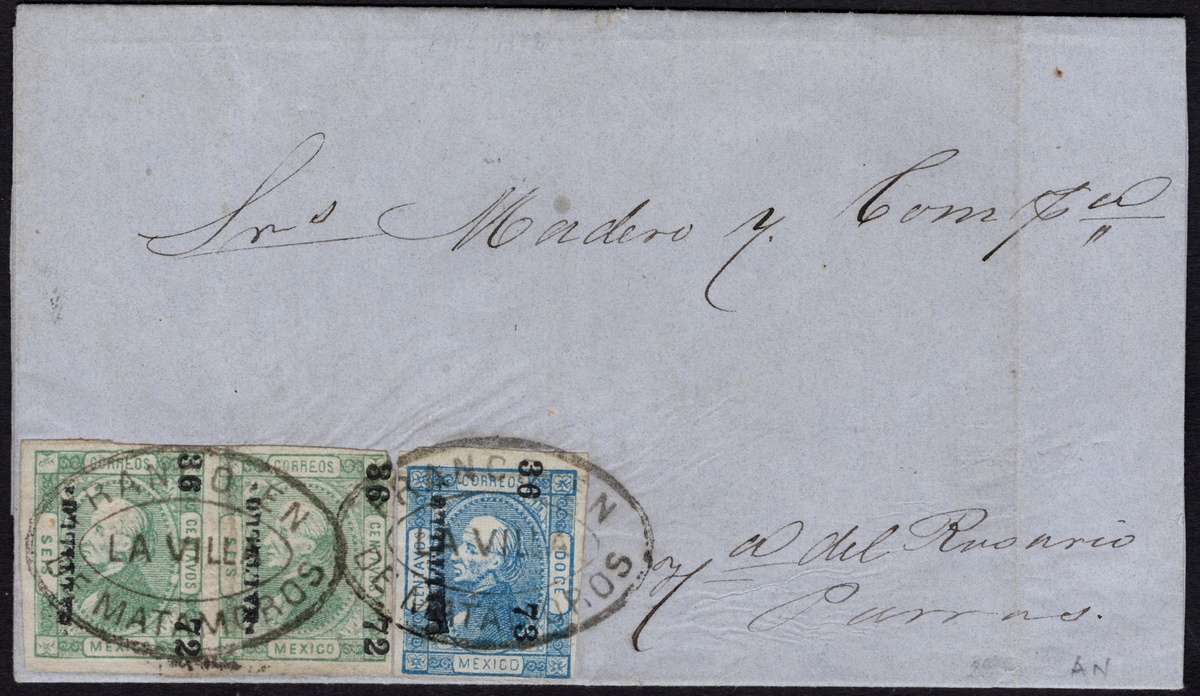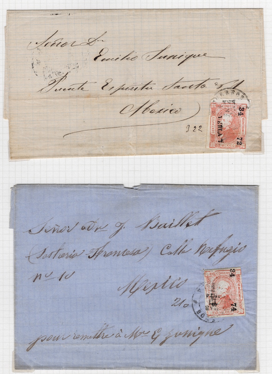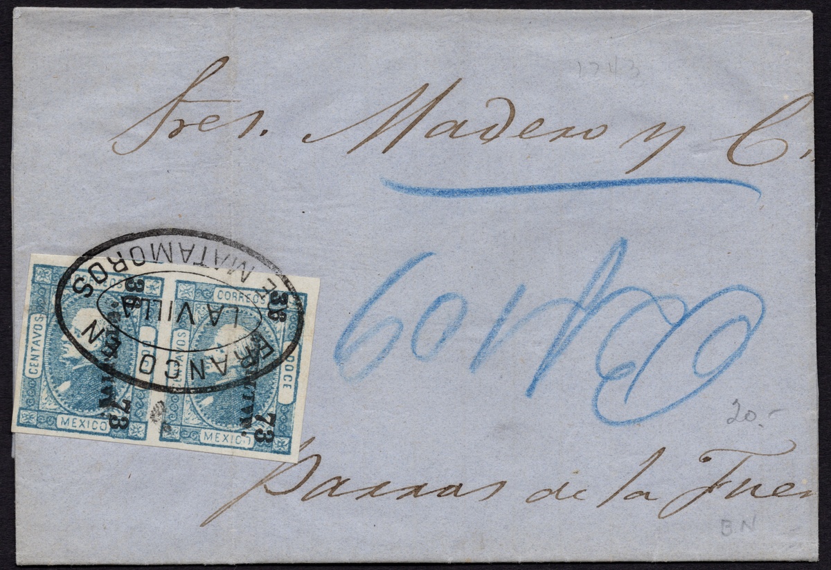 316   imageMexico. 1872 "Hidalgos". Saltillo Duo of pristine, colorful, rare and attractive covers, both tied to imperforate stamps by oval h.s Franco en la Villa de Matamoros: One has 6c. Green pair and 12c. Blue (#36-72) dated May 6, 1873 and the other a 12c. Blue pair (#36-73) dated August 18, 1873, both going to Parras. Margins all around. Matamoros is a border town with very small population. Scott 93-95. (Image) (Image2) (All Images)