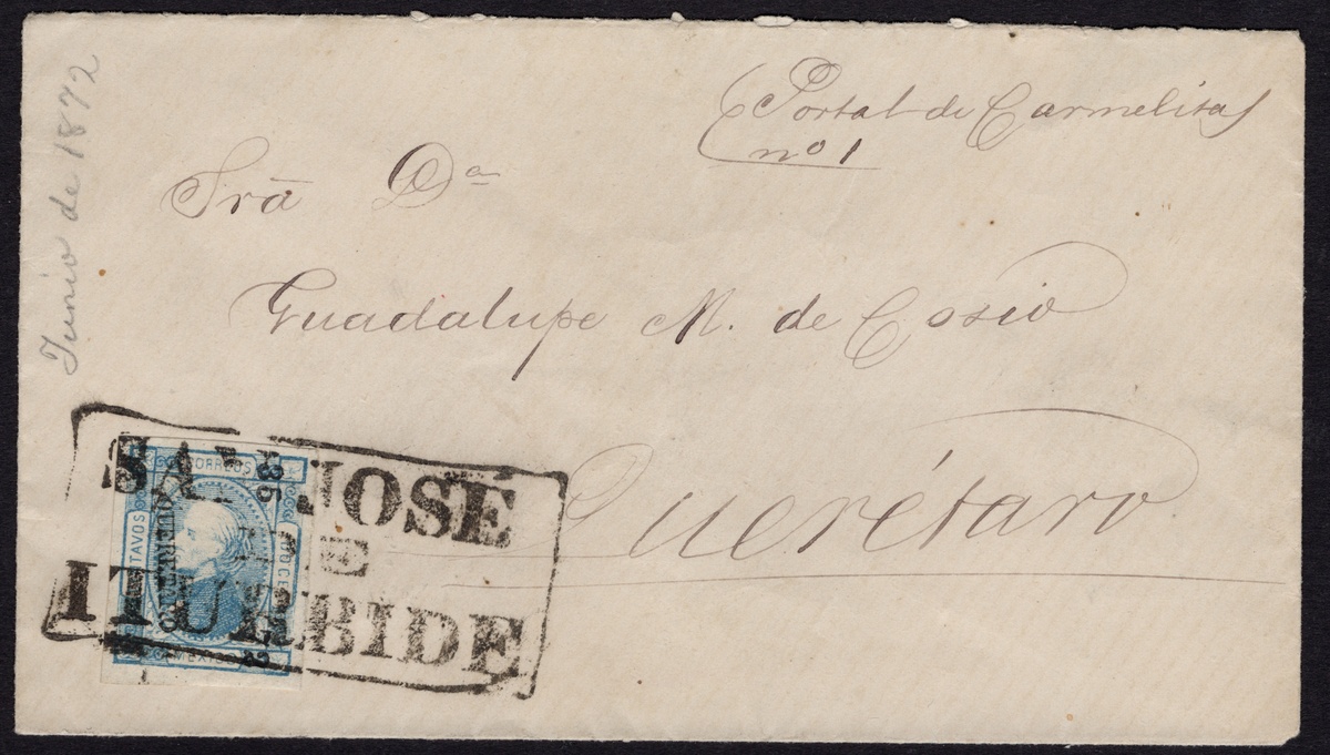 310   imageMexico. 1872 "Hidalgos". Querétaro 12c. Blue imperforate (#35-72), on attractive cover from San José de Iturbide to Querétaro, dated June 1872, with very attractive h.s. and margins all around. Scott 94. (Image)