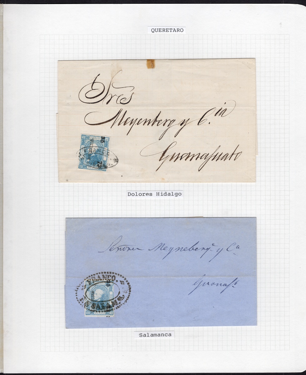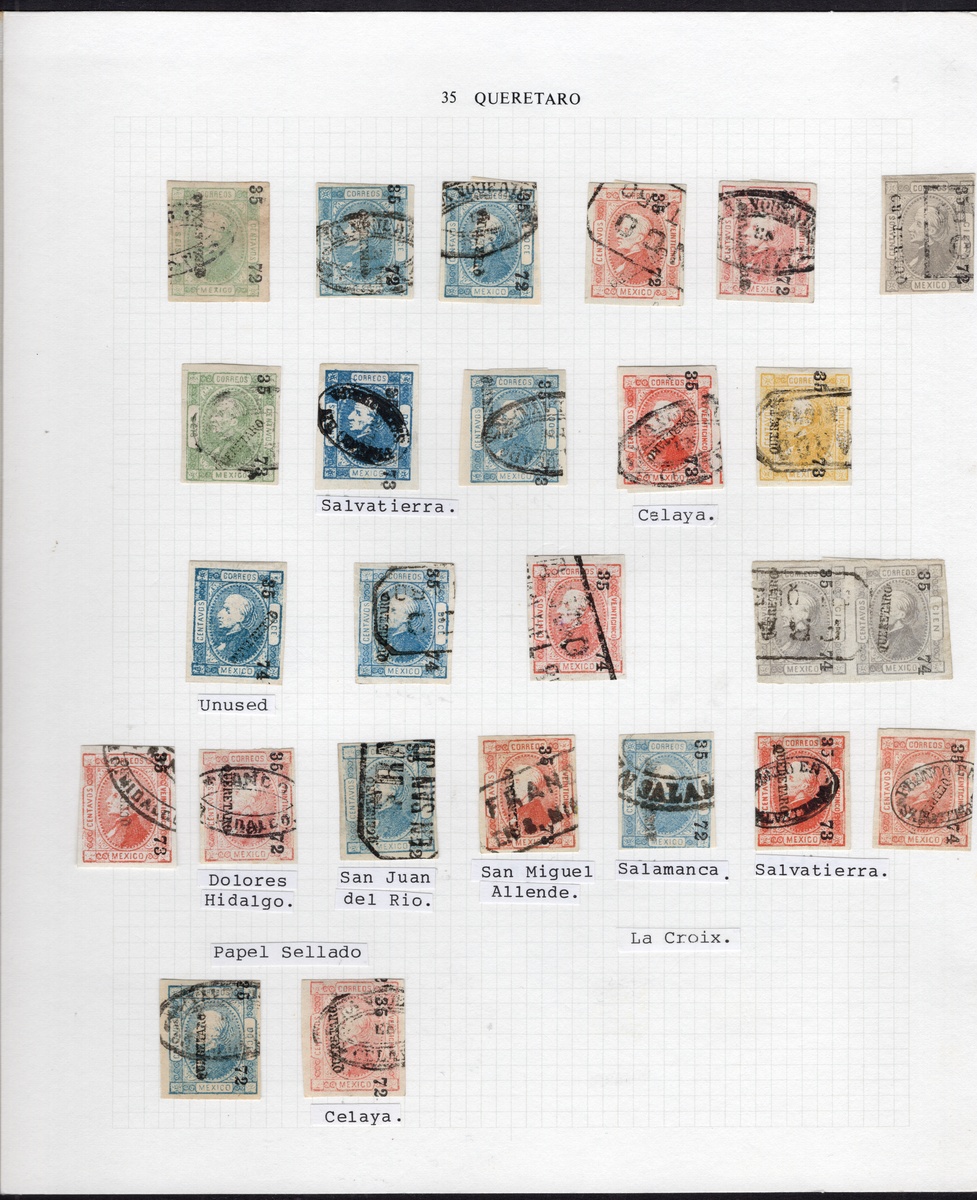311 Used   imageMexico. 1872 "Hidalgos". Querétaro Group of 25 imperforate stamps mostly used and two pristine covers neatly mounted on presentation pages (consignment # 35) with different consignment years 1872-74 each in a row, with no duplication. Stamps include 6c.-100c., as well as two "Papel Sellado" watermarks. There are cancels from Querétaro and several small towns: Salvatierra, Dolores Hidalgo, San Juan del Río, San Miguel de Allende, Salamanca, Celaya. The covers are from Dolores Hidalgo and Salamanca are tied with very attractive cancels. Scott 82-83, 93-96, 98; NF and Scott (for watermarked stamps) is $460 for off cover stamps., , (Image) (Image2) (All Images)