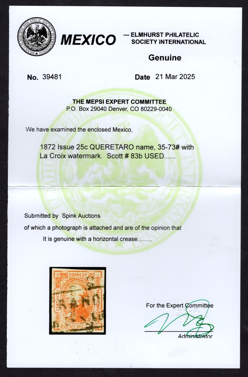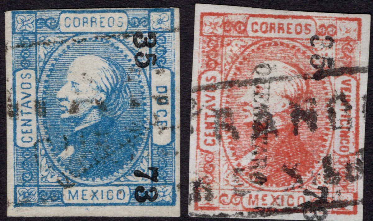 312 Used   imageMexico. 1872 "Hidalgos". Querétaro 12c. Blue and 25c. Red (#35-73), imperforate, both with "La Croix Frères" watermark, used with framed h.s., showing margins all around (one close in the 12c. at top). The 25c. has a horizontal crease. 2025 MEPSI certificate for the 25c. Scott 82b, 83b, $900. (Image) (Image2) (All Images)