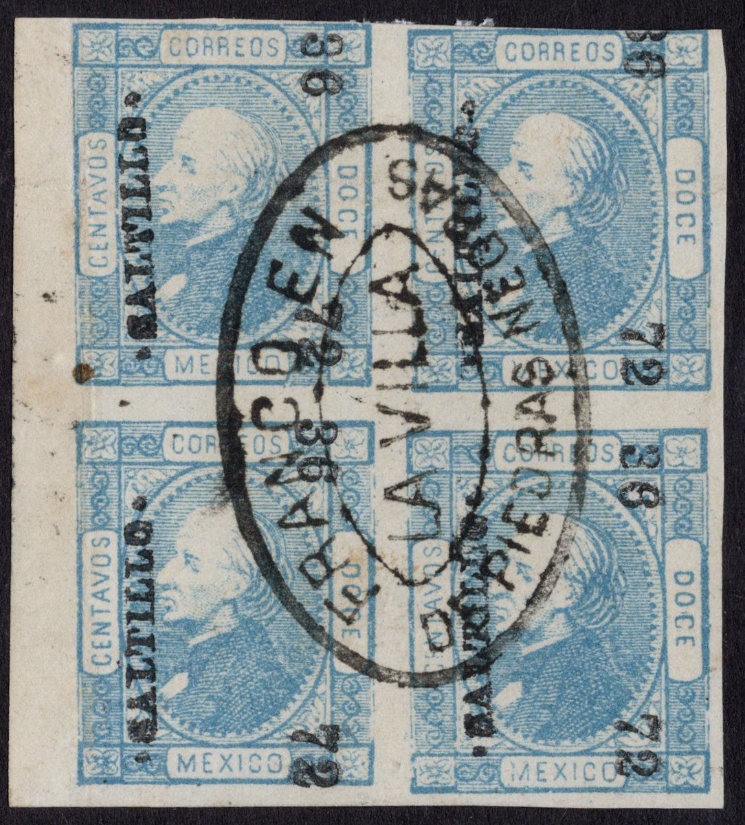 313 Used   imageMexico. 1872 "Hidalgos". Saltillo 13c. Blue imperforate block of four (#36-72), used with perfect strike of the rare oval h.s. from Piedras Negras, clear to huge margins, vibrant deep color. Piedras Negras was a tiny border town and therefore used very few stamps. Scott 94; NF unpriced as a block of four., (Image)