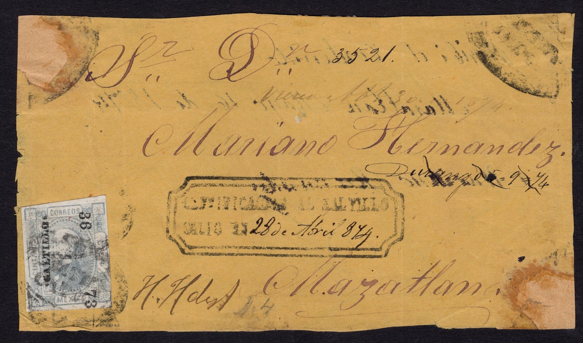 314   imageMexico. 1872 "Hidalgos". Saltillo District 100c. Gray Lilac imperforate (#36-73), slightly cut into at right, otherwise good margins, tied by two faint h.s. to registered cover front from Saltillo to Mazatlán on April 28, 1874. Postal rules required the recipient to sign the front of registered mail as proof of receipt, after which it was sent back to the originating office and destroyed two years later, with this explaining why so few examples remain today. Scott 98. (Image)