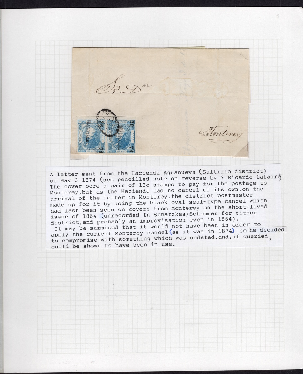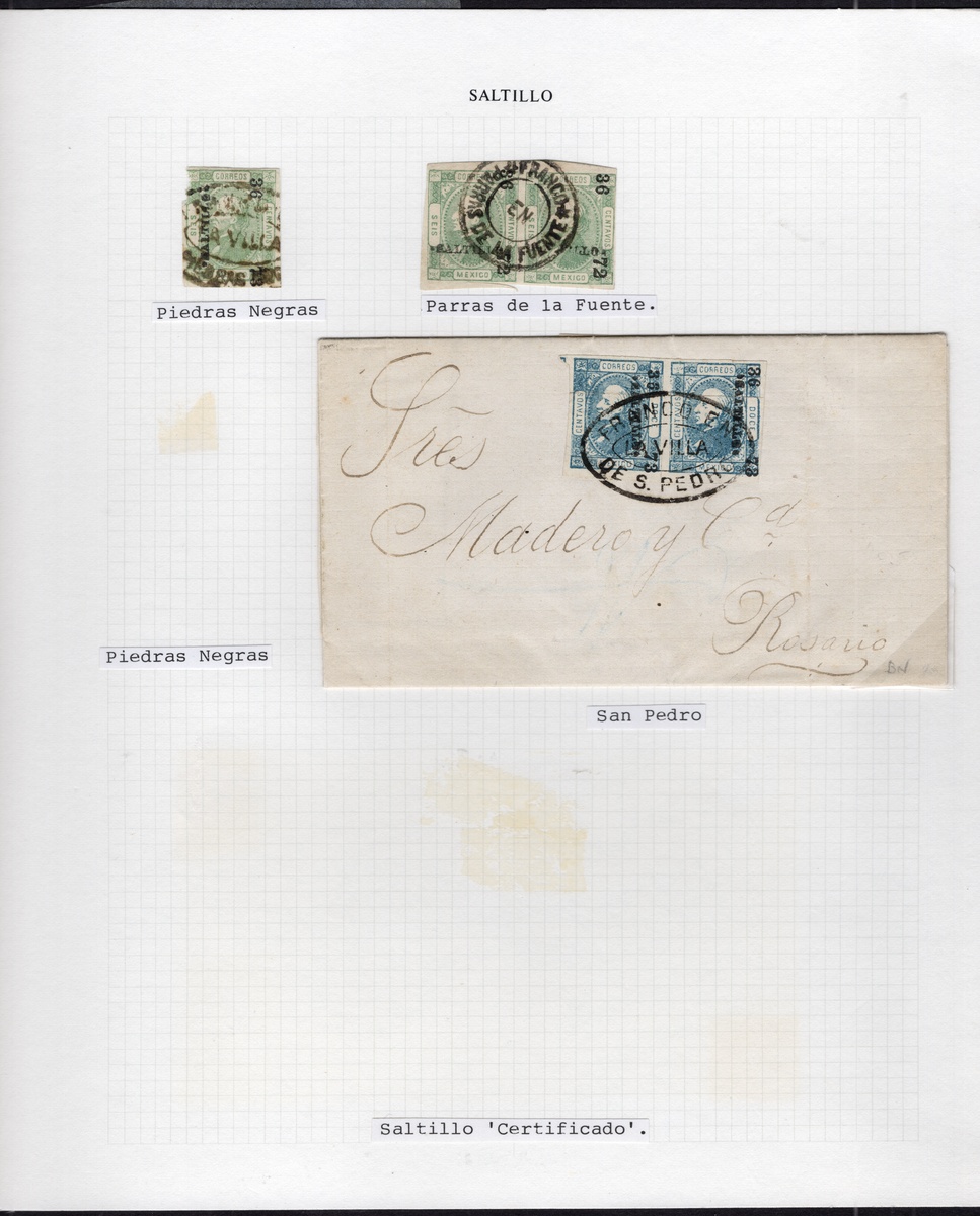 315 Used   imageMexico. 1872 "Hidalgos". Saltillo Group of 19 imperforate stamps, mostly used, and two attractive covers, neatly mounted on presentation pages (consignment #36)with different consignment years 1872-74 each in a row, with no duplication. One cover is pristine, bearing a pair of 12c. Blue (#36-73) with a perfectly struck Villa de San Pedro cancel; the other cover features a mute cancel. The collection also includes an unused block of four 6c. stamps. Denominations range from 6c. to 100c., and there are two stamps with the “Papel Sellado” watermark. Cancellations include Saltillo and several small towns: Parras, San Pedro, and Piedras Negras. Predominantly in very fine condition. One 2025 MEPSI certificate. Scott 82-83, 93-96, 98; NF and Scott (for watermarked stamps) is $453 for off cover stamps., , , (Image) (Image2) (Image3) (Image4) (Image5) (All Images)