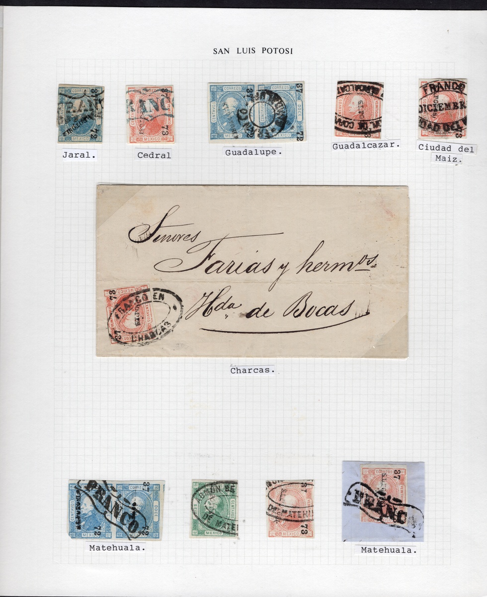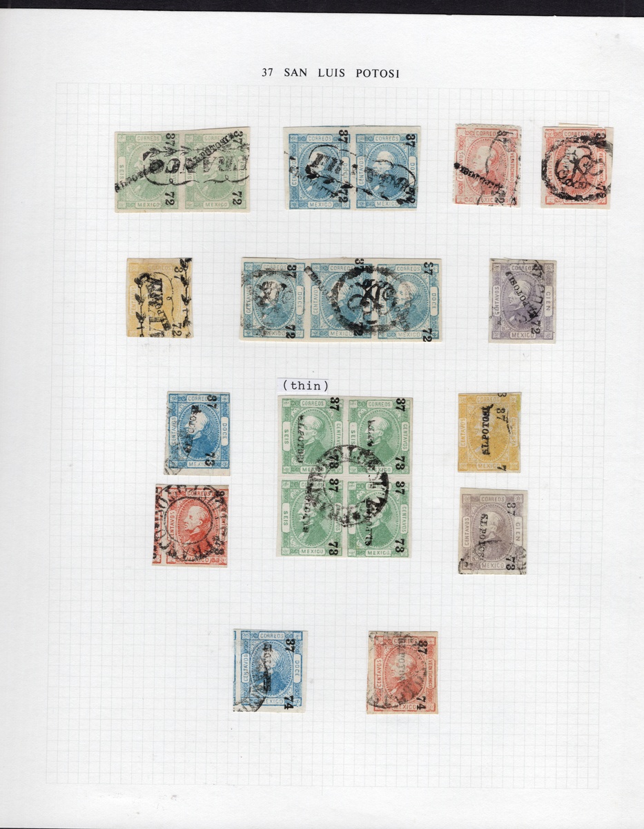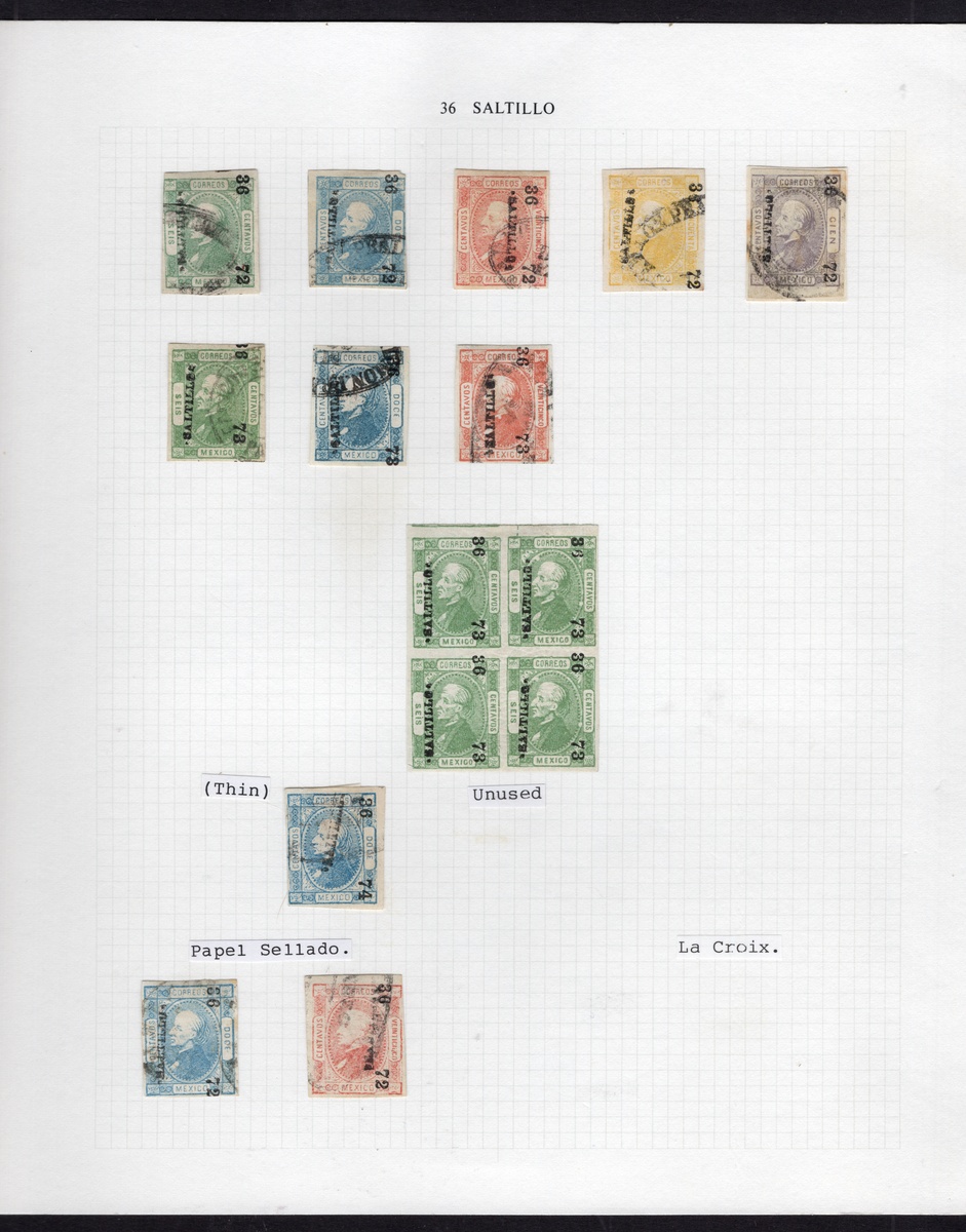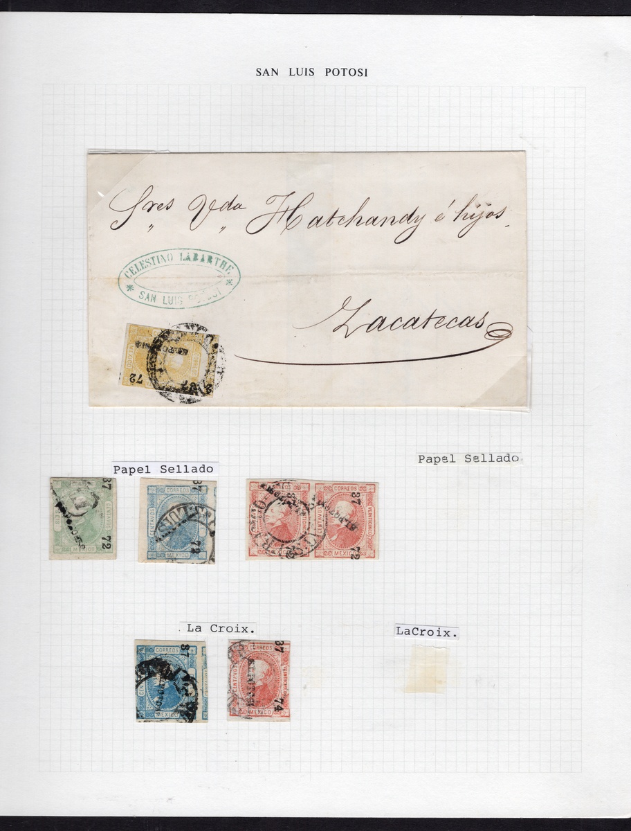 320 Used   imageMexico. 1872 "Hidalgos". San Luis Potosí Group of over 30 imperforate stamps, used, and with two covers, neatly mounted on presentation pages (consignment #37) with different consignment years 1872-74 each in a row, with no duplication. Denominations range from 6c. to 100c., including six stamps with the “Papel Sellado” or “La Croix” watermark. Cancellations feature Saltillo and several small towns: Jaral, Cedral, Guadalupe, Guadalcázar, Ciudad del Maíz, and Charcas. One cover is scarce -a 50c. Yellow tied to cover to Zacatecas (#37-72)- while the other bears a 25c. Red (#37-73) canceled in Charcas. Margins on both covers are tight. The group also includes a beautiful 6c. Green block of four, canceled in San?Luis?Potosí (with a thin). Scott # 81-83, 82b, 83b, 93-96, 98; NF and Scott (for watermarked stamps) is $1,619 for off cover stamps., , , (Image) (Image2) (Image3) (All Images)
