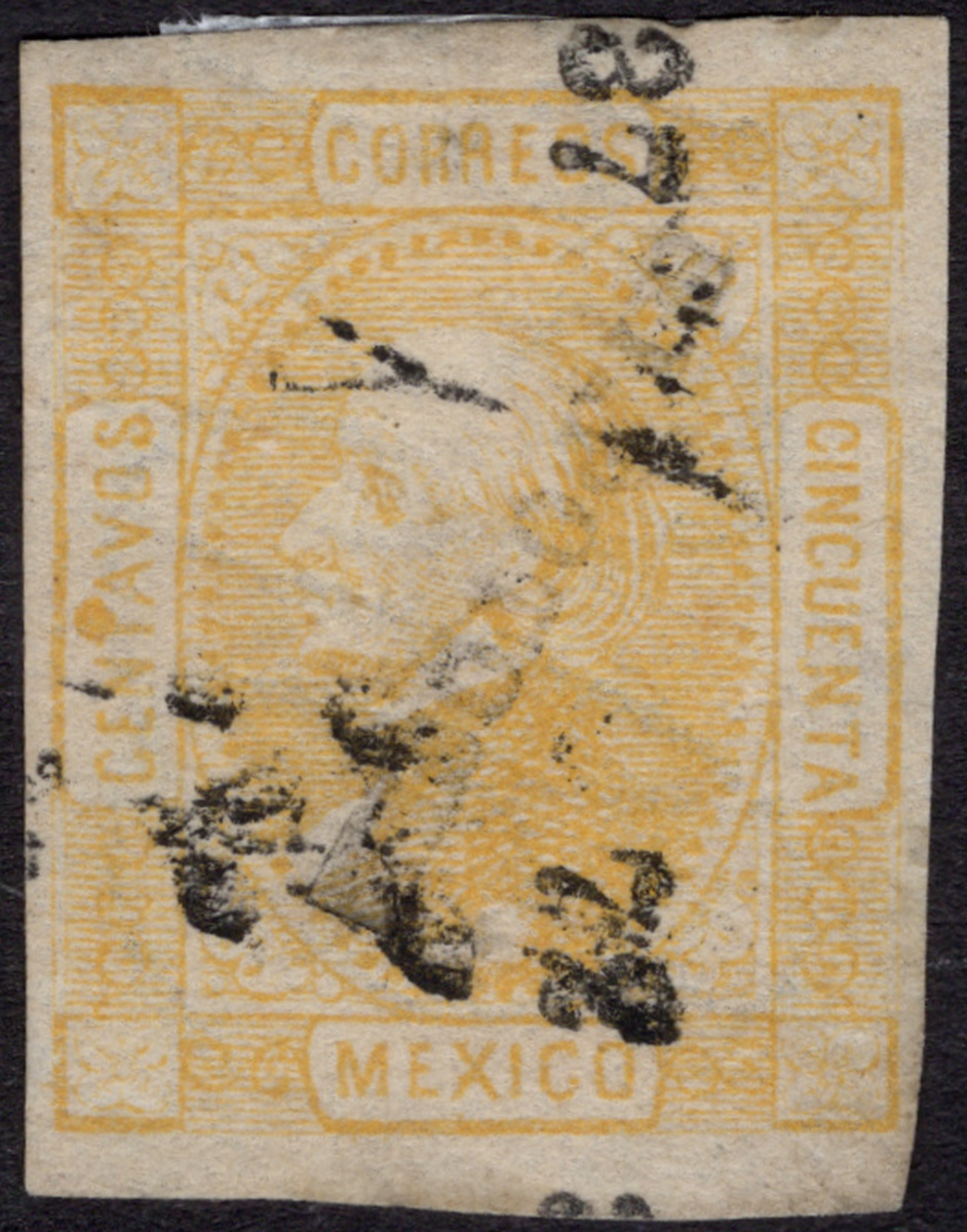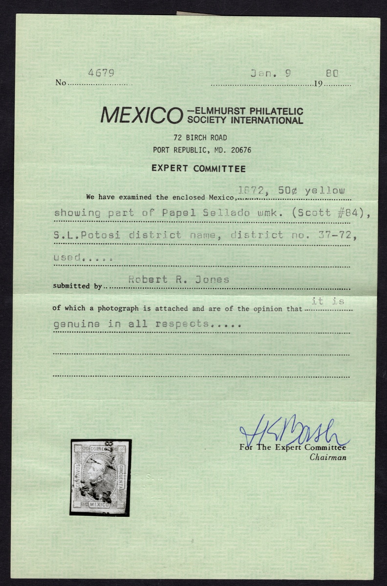 318 Used   imageMexico. 1872 "Hidalgos". San Luis Potosí 50c. Yellow imperforate (#37-72), "Papel Sellado" watermark, a used example with margins all around. 1980 MEPSI certificate. Scott 84, $850. (Image) (Image2) (All Images)