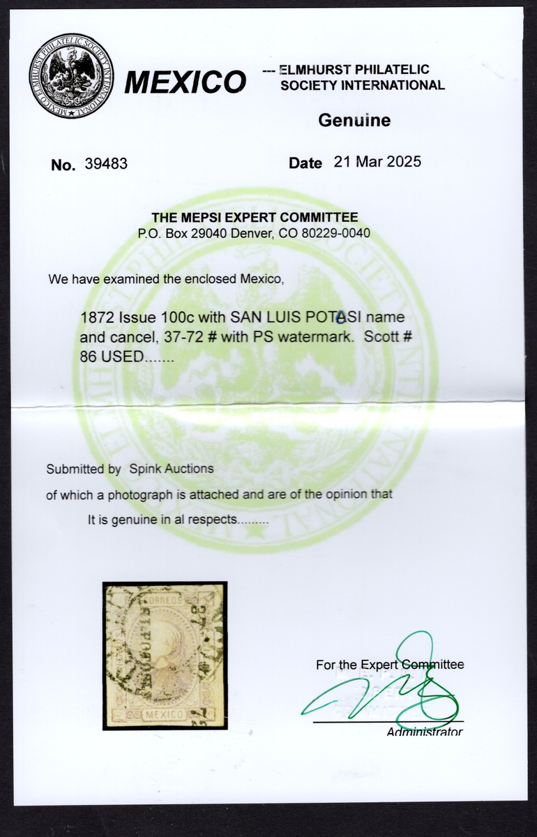 319 Used   imageMexico. 1872 "Hidalgos". San Luis Potosí 100c. Gray Lilac imperforate (#37-72), a used example with "Papel Sellado" watermark and c.d.s., margins all around, small thin. 2025 MEPSI certificate. Scott 86, $650. (Image) (Image2) (All Images)
