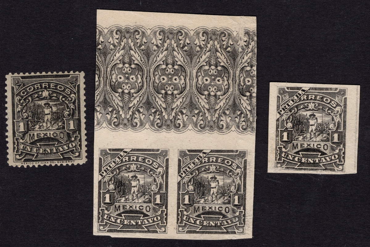361 Proof   imageMexico. 1895 "Mulitas". 1895 1c. "Mulitas", imperforate sample specimen stamps on black on card, including one single and one pair. Both items displaying the "PRUEBA" banner diagonally at top right, with the pair having the elaborate fancy decorations in the sheet margin. Scott 242v. Note: These were samples produced by the British printer Bradbury and Wilkinson, with the purpose of showing the quality of their work to the Mexican postal authorities. They copied the existing design and printed very few. Only a couple of complete sheets are known. This firm was hired to produce the following stamp set in 1899. A stamp from the issue is included for comparison. (Image)
