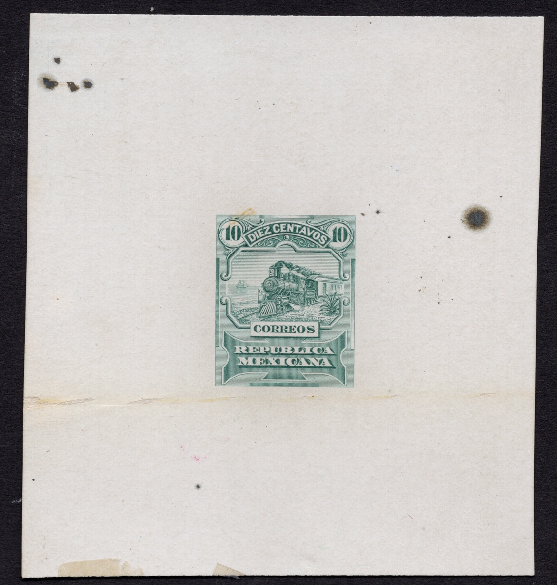 362 Proof   imageMexico. 1895 "Mulitas". 1895 10c. Green, die proof of unissued design (essay) on glossy card. Some oxidation spots not detracting from this unique piece. The only known example, exhibiting a similar design to the 10 Pesos, but denominated 10 centavos. Roberto Liera considered this one of the rarest items of Mexican philately. Ingham described it as "very scarce if not unique". Note: John Bash mentions this essay, and the other essay of the frame also offered in this sale, on page 312 of "Mexicana" (October 1964) and Chapman adds: "This proof is a designed by Edward Bouligay of 'Bouligay and Schmidt'. The die proof was damaged because it was applied pressure before being hardened and therefore is likely this is the unique example in existence". (Image)
