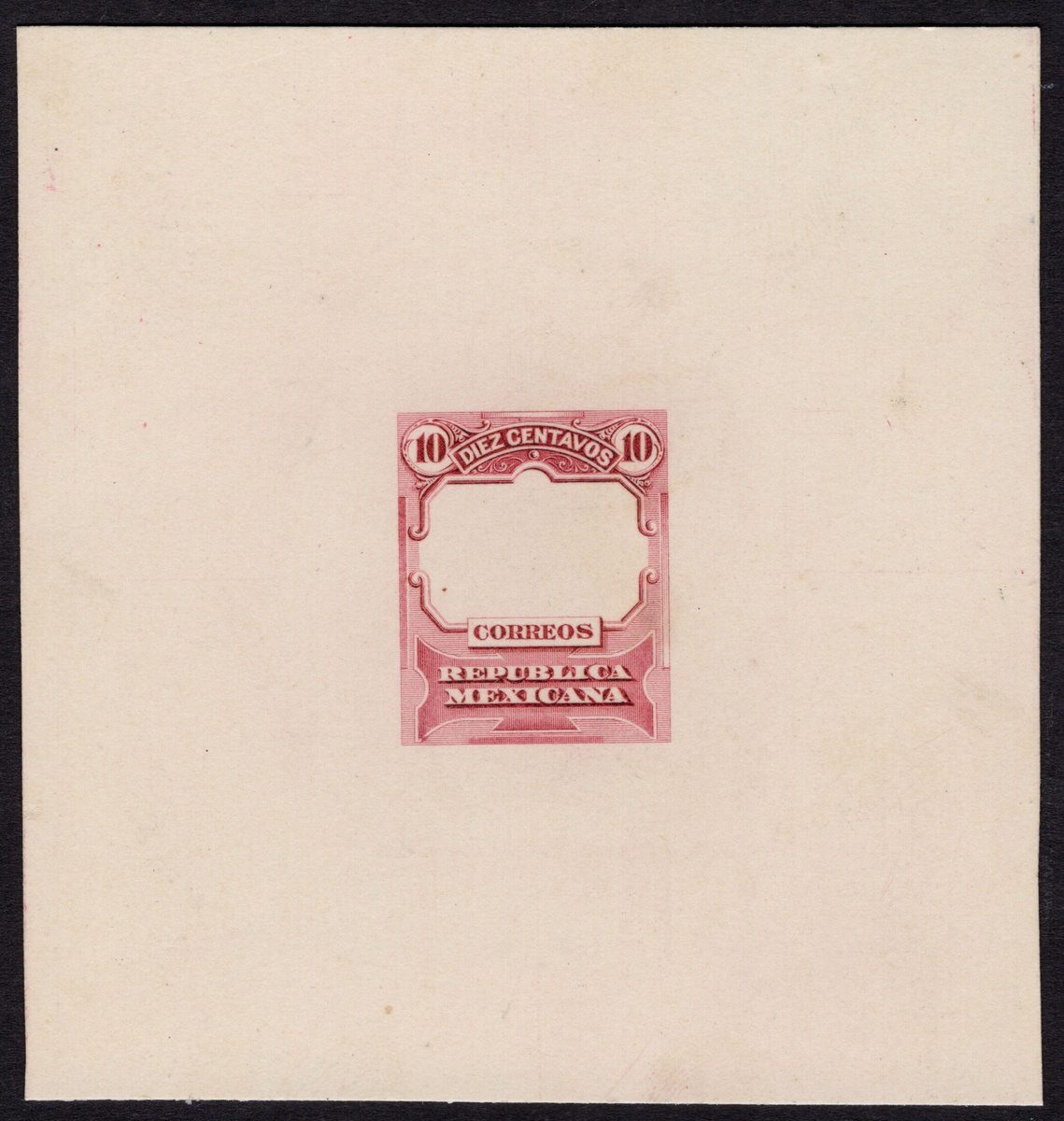 363 Proof   imageMexico. 1895 "Mulitas". 1895 10c. Black, die proof of frame of unissued design (essay) on glossy card. The only example recorded of the frame, with a similar design to the 10 Pesos, but denominated 10 centavos. Roberto Liera considered this one of the rarest items of Mexican philately. Ingham described it as "very scarce if not unique". Note: John Bash mentions this essay, and the other essay of the frame also offered in this sale, on page 312 of "Mexicana" (October 1964) and Chapman adds: "This proof is a designed by Edward Bouligay of 'Bouligay and Schmidt'. The die proof was damaged because it was applied pressure before being hardened and therefore is likely this is the unique example in existence". (Image)