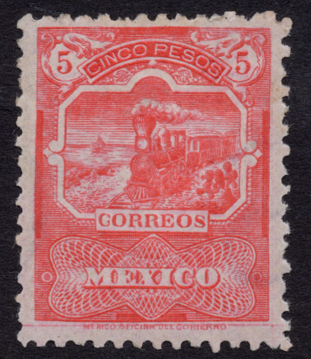 365   imageMexico. 1895 "Mulitas". 1895 5 Pesos Red, "CORREOSEUM" watermark, unused with original gum and well centered. Scott 255, $300. (Image)