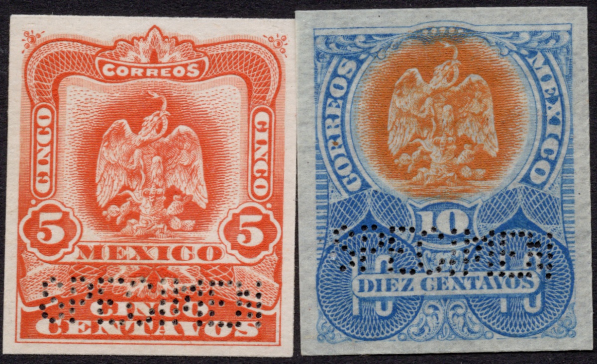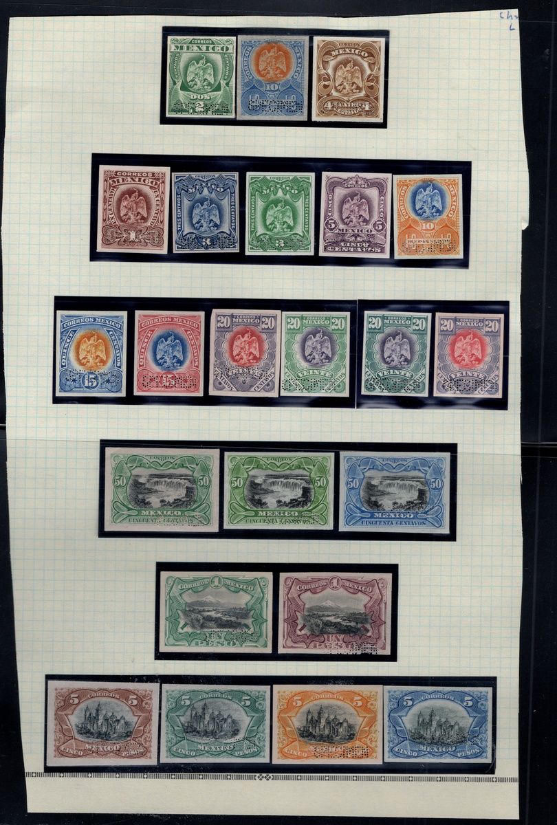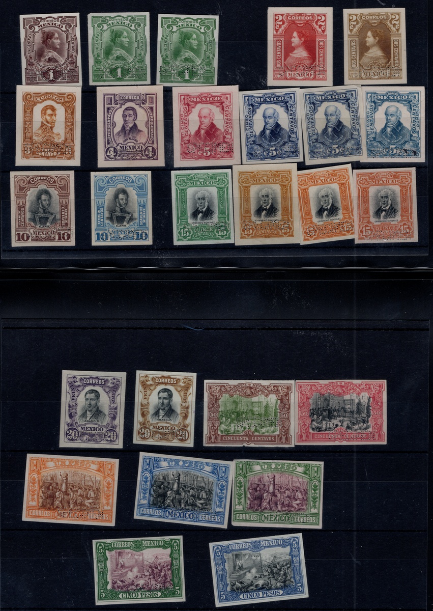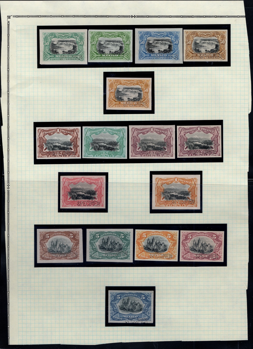 367 Proof   imageMexico. 1899-1903 "Aguilitas". 1899, "Aguilitas," group of 40 trial color proofs of the complete set from 1c. to 5p., each with "Specimen" perfin. An extraordinary assembly showing vibrant colors and superb engraving by Bradbury, Wilkinson & Co. Like other security printers, the firm prepared small albums with samples of their work; however, these differed from their competitors as the impressions were taken directly from the die, printed on stout paper, and perforated “SPECIMEN” in a straight line at lower right. Scott 294 var- 303 var. (Image) (Image2) (All Images)