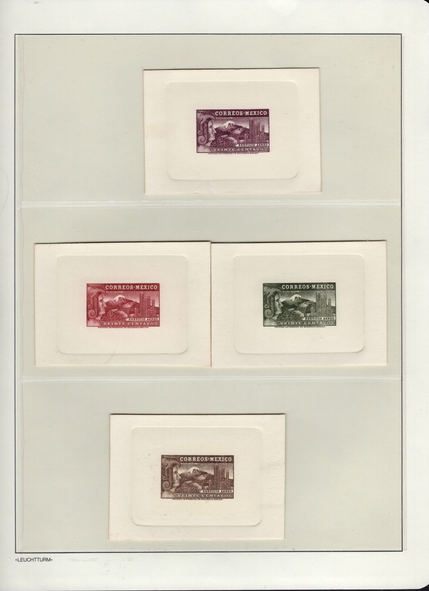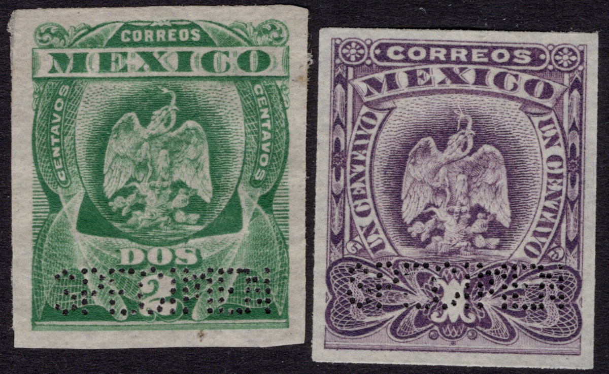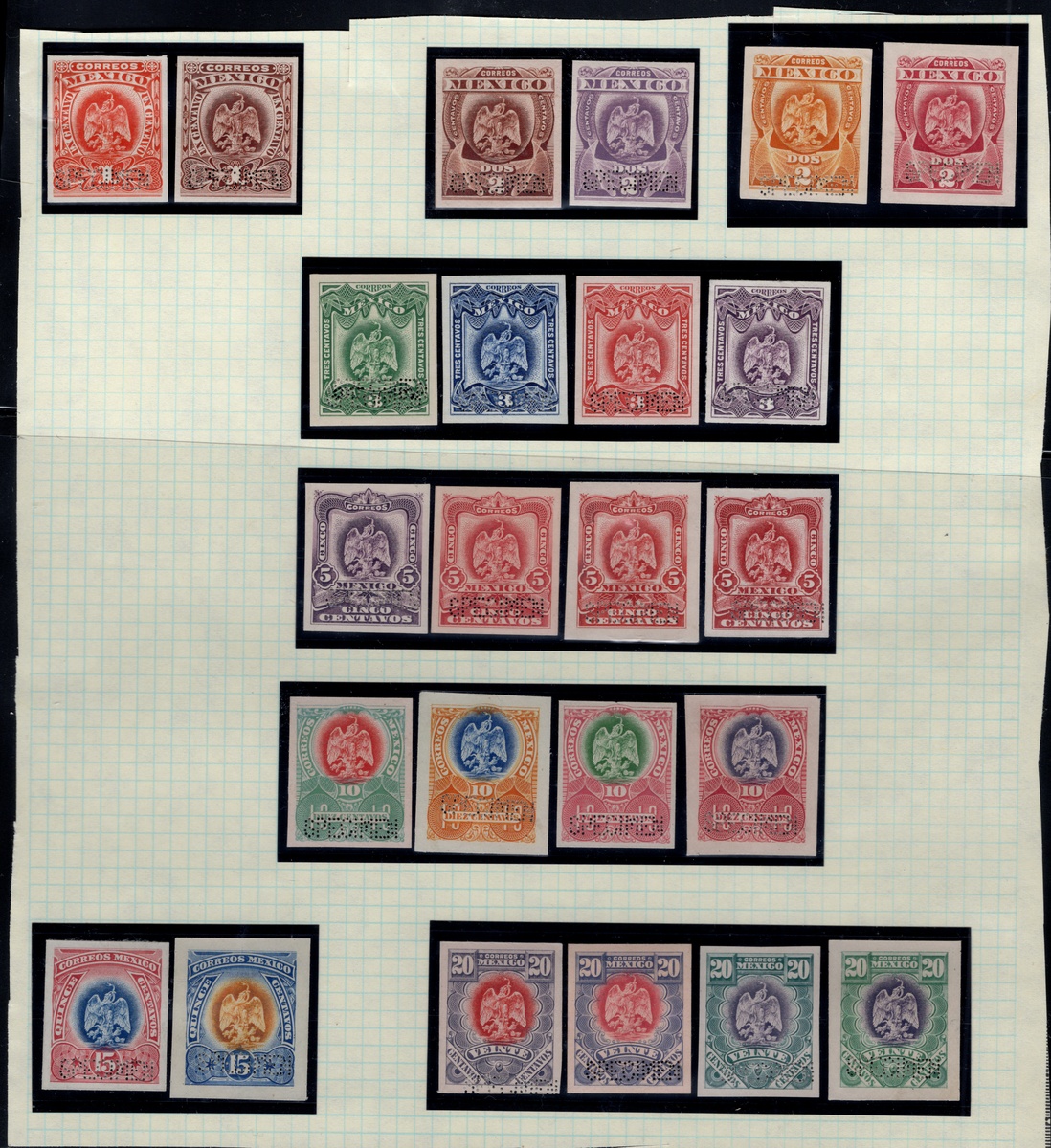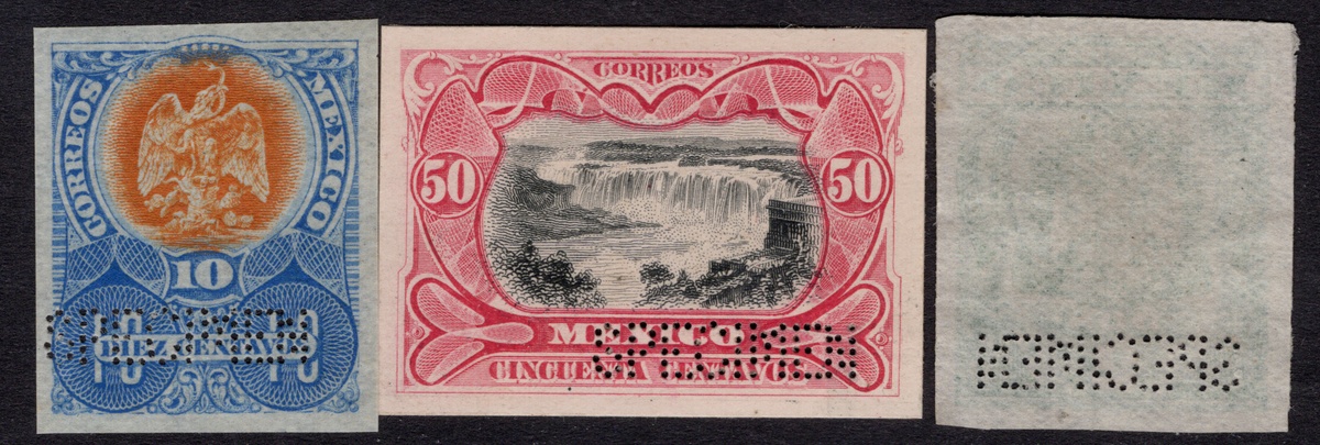 367 Proof   imageMexico. 1899-1903 "Aguilitas". 1899, "Aguilitas," group of 40 trial color proofs of the complete set from 1c. to 5p., each with "Specimen" perfin. An extraordinary assembly showing vibrant colors and superb engraving by Bradbury, Wilkinson & Co. Like other security printers, the firm prepared small albums with samples of their work; however, these differed from their competitors as the impressions were taken directly from the die, printed on stout paper, and perforated “SPECIMEN” in a straight line at lower right. Scott 294 var- 303 var. (Image) (Image2) (All Images)