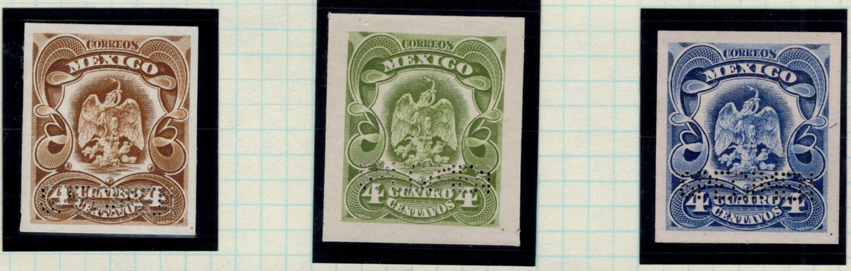 369 Proof   imageMexico. 1899-1903 "Aguilitas". 1903 "Aguilitas," group of three trial color proofs of the 4c. (added to the 1899 set to satisfy the UPU postcard rate) in the following unissued colors: brown, olive green, and dark blue. Bright colors and superb engraving printed by Bradbury Wilkinson. Like other security printers, the firm prepared small albums with samples of their work; however, these differed from their competitors as the impressions were taken directly from the die, printed on stout paper, and perforated "Specimen" in a straight line at lower right. Scott 306 var. (Image)