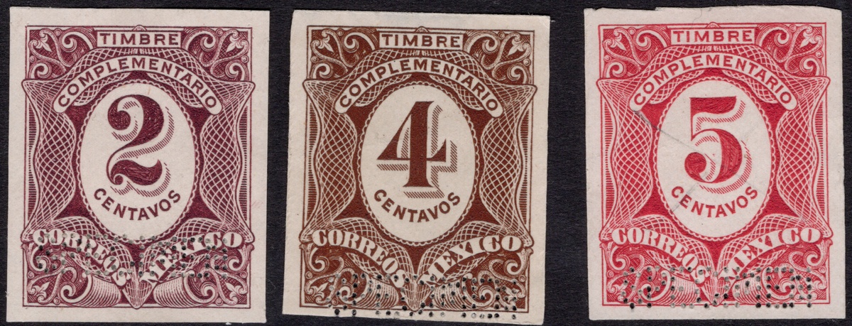 370 Proof   imageMexico. 1908 "Postage Dues "Complementarios". 1908 "Postage Due Complementarios" Group of three scarce trial color proofs in Dark Purple (2c.), Brown (4c.) and Dark Burgundy Red (5c.). Magnificent engraving and vivid colors, with impressions taken directly from the die, printed on stout paper, and perforated "Specimen" in a straight line at lower right. Scott J2 var-J4 var. (Image)