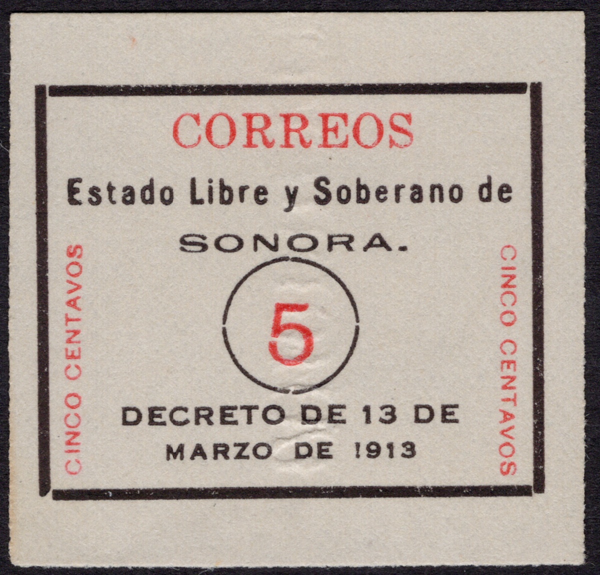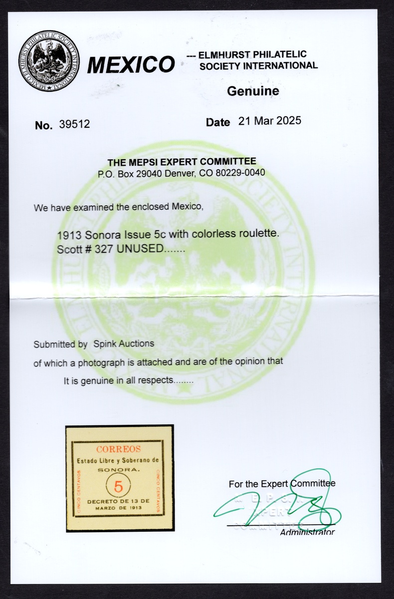 372   imageMexico. Later Issues. 1913 5c. Sonora White colorless roulette unused, no gum. A pristine example. 2025 MEPSI certificate. Scott 327, $1,200. (Image) (Image2) (All Images)
