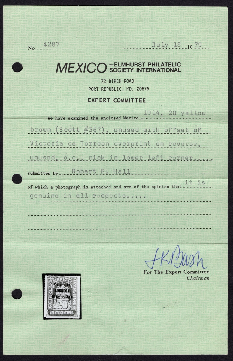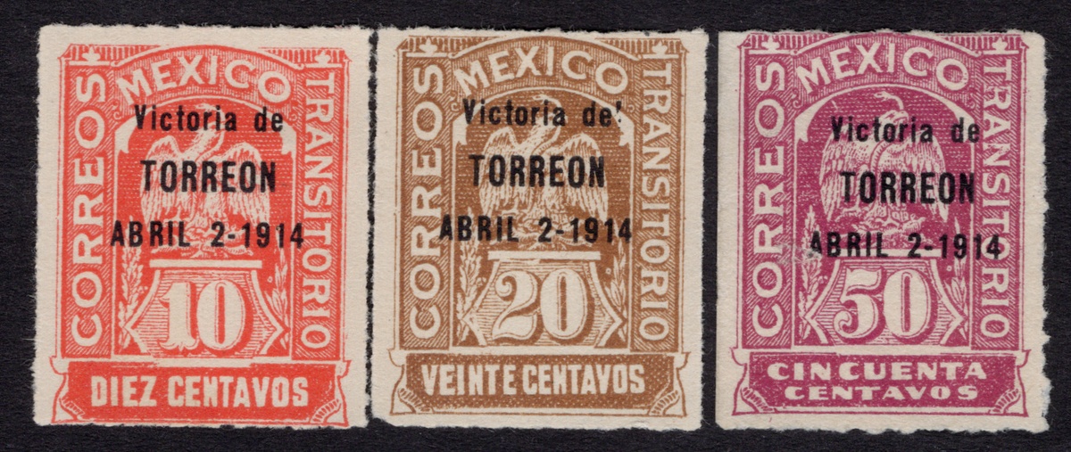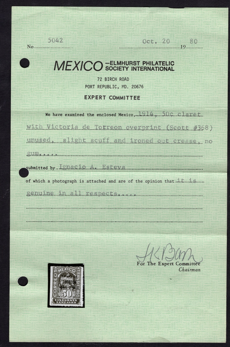 373   imageMexico. Later Issues. 1914 "Victoria de Torreón" 1c.-50c., complete set unused, including 1c. and 10c. n.h., 50c. without gum, the rest being hinged. The 20c. with offset image of the overprint on the reverse (tiny nick in lower corner), the 2c. and 4c. with thin spots, and the 50c. affected by a slight scuff and iron-out crease. Only 100 20c. and 50 50c. were issued. 1970, 1980 MEPSI certificates for the 20c. and the 50c. Scott 362-368, $6,860. (Image) (Image2) (Image3) (Image4) (Image5) (All Images)