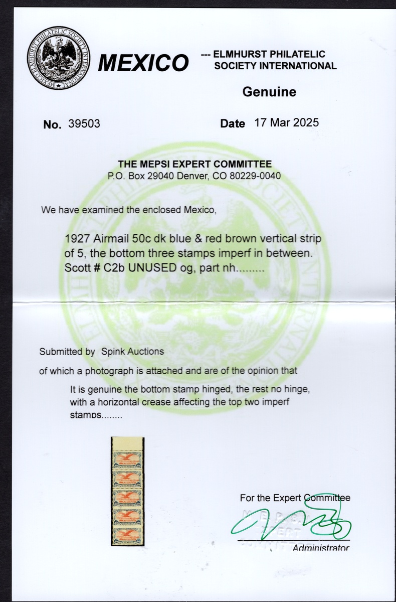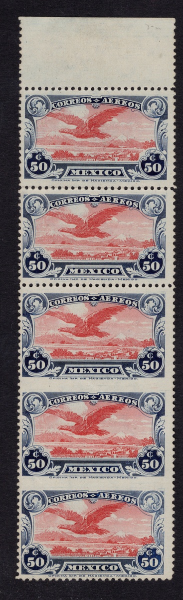 374   imageMexico. Later Issues. 1927 Airmail 50c. vertical strip of five, unused with the last two stamps imperforate between, o.g. with the bottom stamp hinged and the rest n.h. Horizontal crease affecting the two imperforate stamps. A great modern rarity, as only four strips are believed to exist. 2025 MEPSI certificate. Scott C2b, $7,500., (Image) (Image2) (All Images)