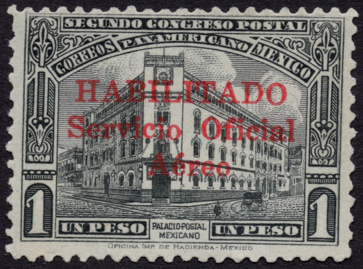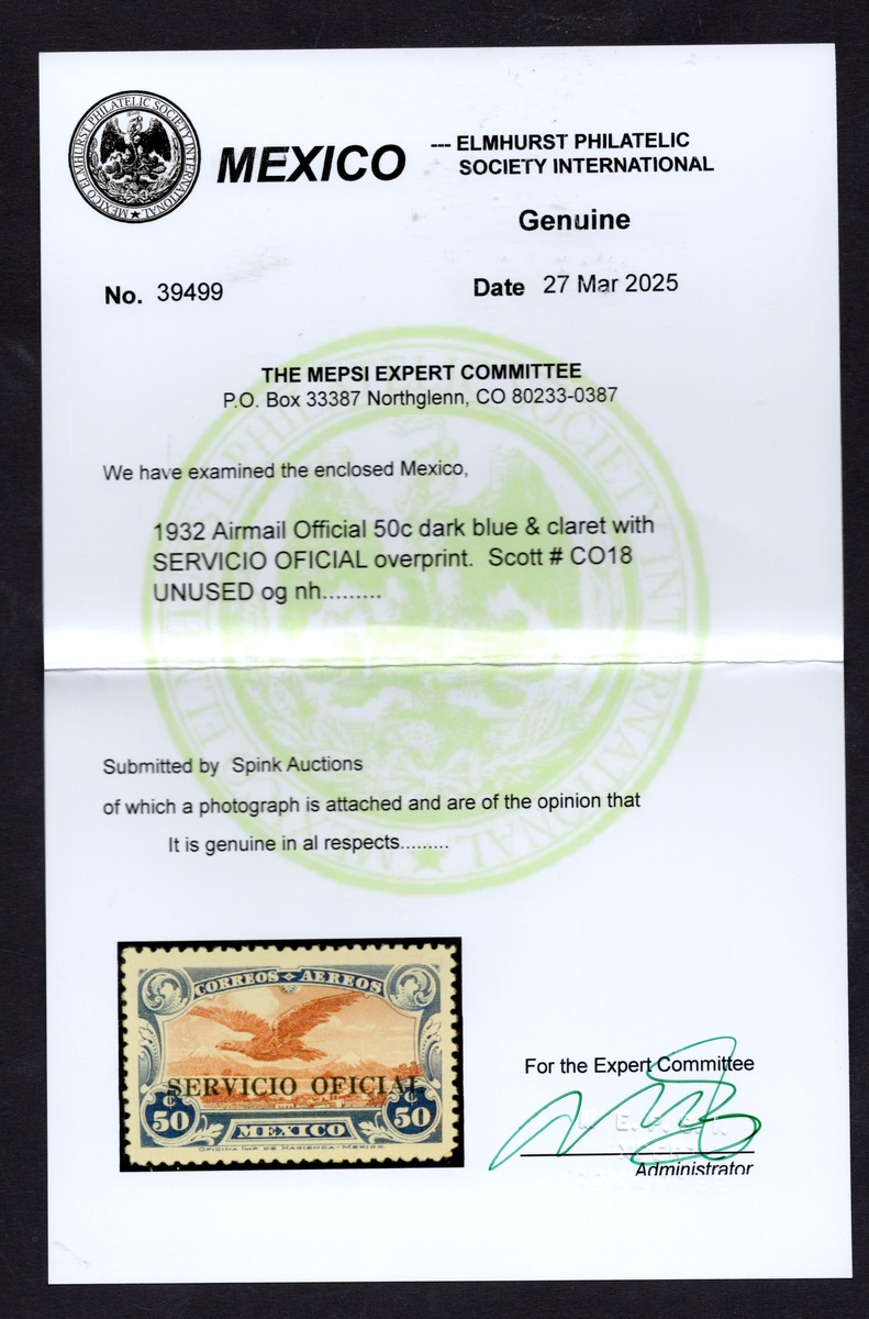 377   imageMexico. Later Issues. 1932 Airmail Official 50c. with "Servicio Oficial" overprint, unused with o.g. and n.h., well centered. 2025 MEPSI and 1995 AP certificates. Scott CO18, $2,000. (Image) (Image2) (All Images)