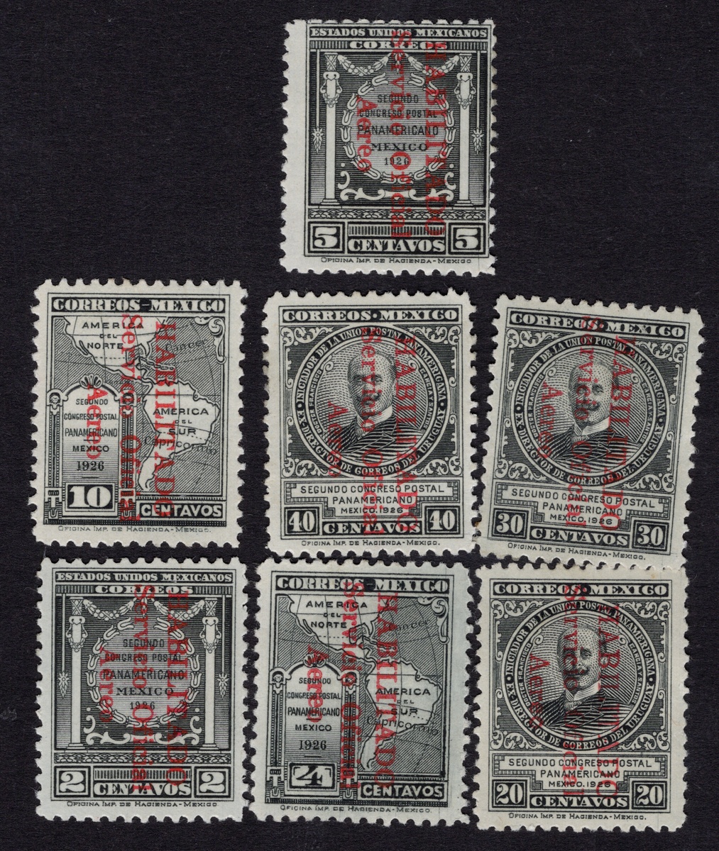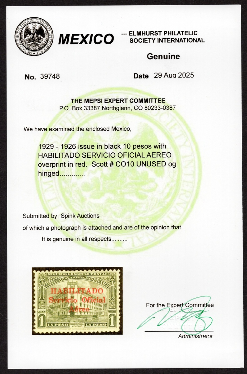 375   imageMexico. Later Issues. 1929 Airmail Official "Servicio Oficial Aéreo" overprinted 2c. to 1p. black, complete set with red overprint and original gum; the 5c. is centered toward the top right, touching the design. Only 600 stamps of the 2c. to 40c. denominations were issued; the 1p. is a rarity, with just 128 examples issued. This is a difficult and key stamp to complete the set, centered slightly to the top, with a 2025 MEPSI certificate. The 2c., 5c., 40c., and 1p. are signed by Kessler. Scott #CO3-CO10, $2,775. (Image) (Image2) (Image3) (All Images)