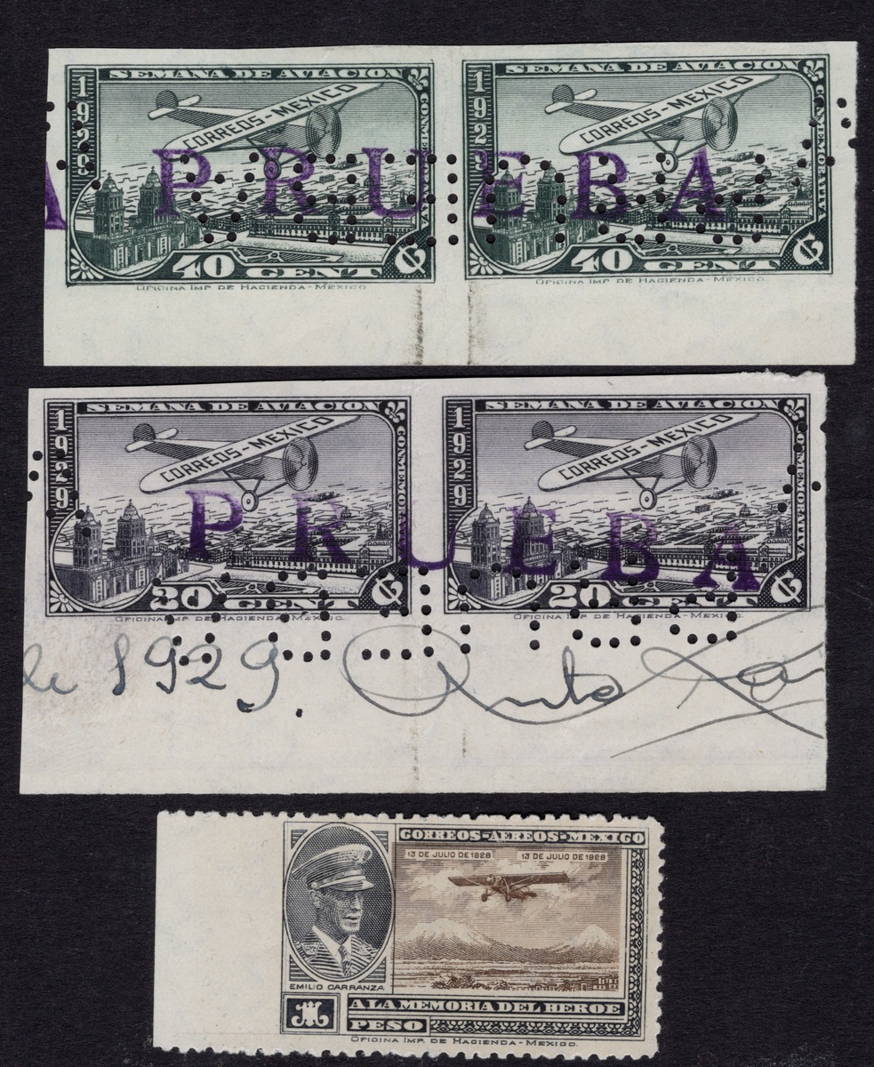 376   imageMexico. Later Issues. 1929 Airmail 20c. Black Violet and 40c. Slate Green, horizontal imperforate pairs, the former with large selvage, dated and signed, at bottom; as well as Emilio Carranza 1 Peso imperforate at left. A scarce airmail trio. Scott C26v, C27v, C10v. (Image)