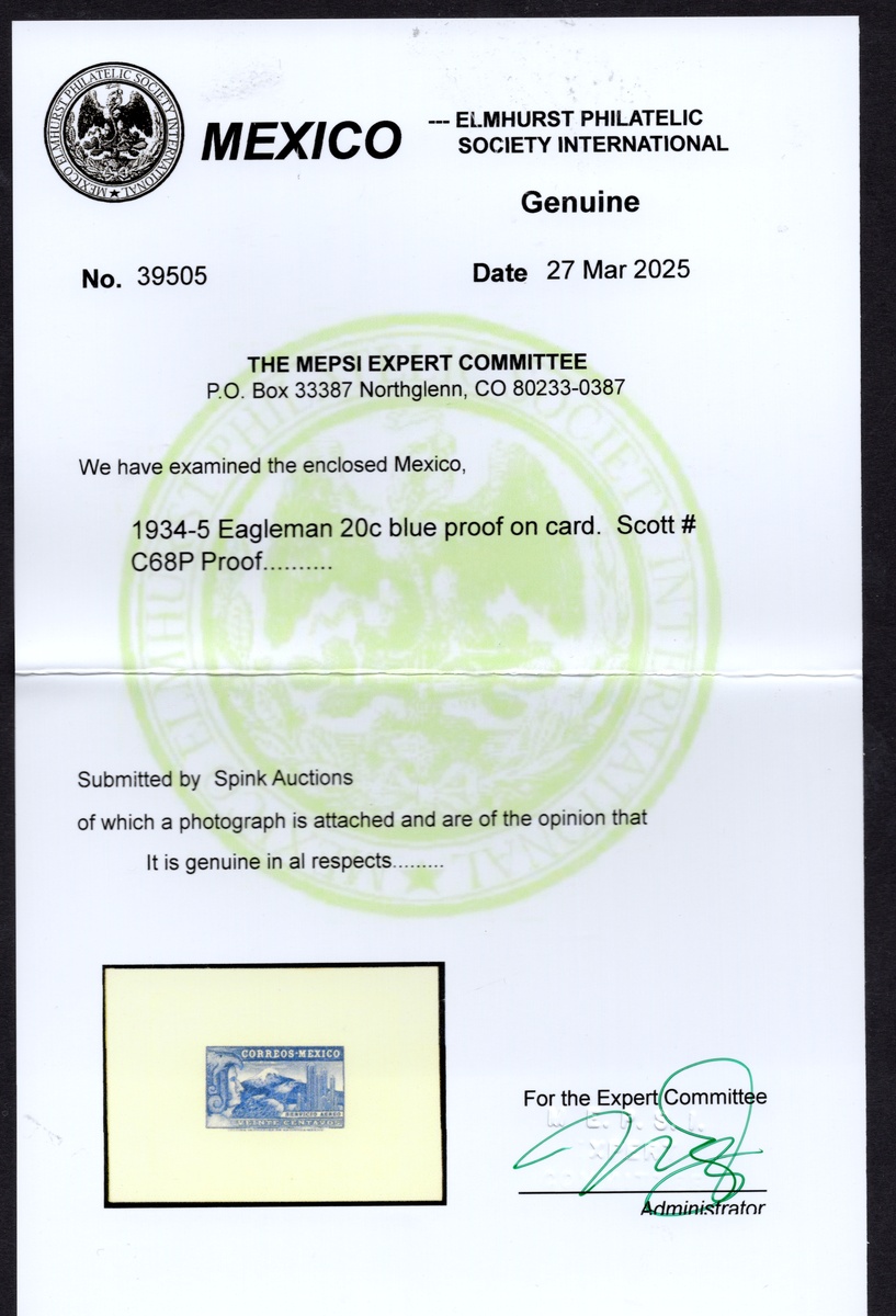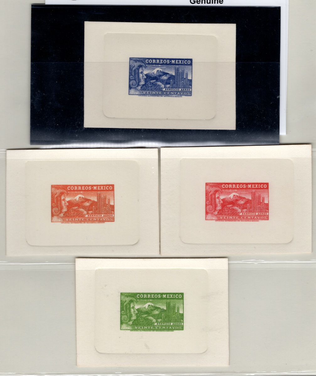 378 Proof   imageMexico. Later Issues. 1934 20c. "Eagleman", airmail set of eight color die proofs on card, with colors including green, red, black, vermilion, lake, dark red. One with 2025 MEPSI certificate. Scott C68v. (Image) (Image2) (Image3) (All Images)