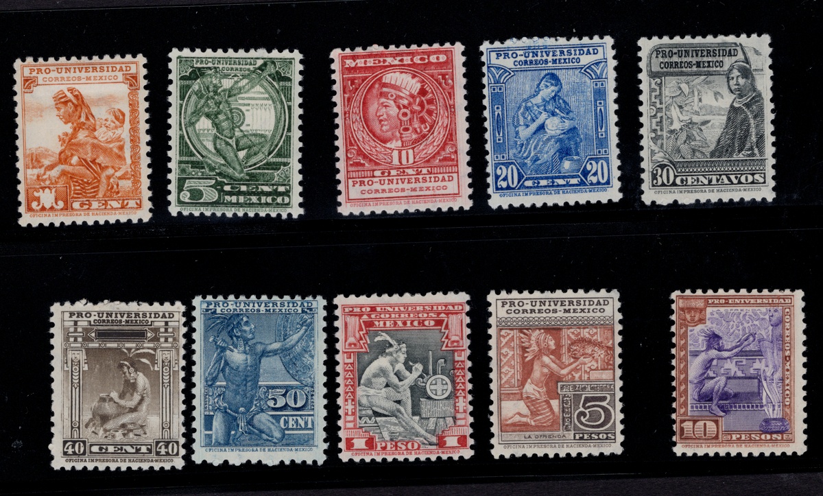 379   imageMexico. Later Issues. 1934 "Pro Universidad", the complete set issued for the regular mail in unused condition, with original gum and hinged. The centering vary, including a well centered 5p. and the 10p. centered to top left but not affecting the design. Scott 698-706, RA 13B, $3,430. (Image)