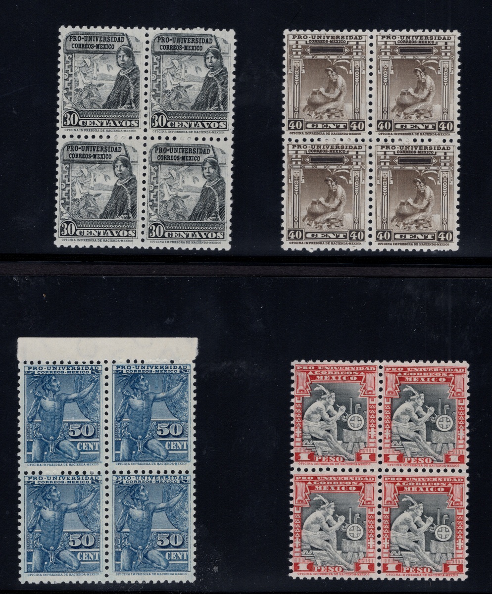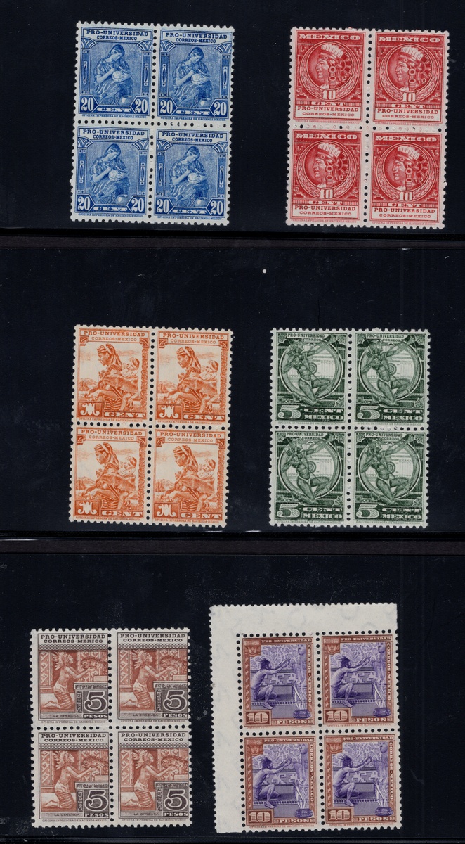 380   imageMexico. Later Issues. 1934 "Pro Universidad", the complete set issued for the regular mail in never hinged blocks of four (except for one 5c. example which shows a hint of hinging, not detracting), good centering except for the 5 pesos only, being centered to top right. Very scarce. Scott 698-706, RA 13B, $30,000 for all n.h., (Image) (Image2) (All Images)