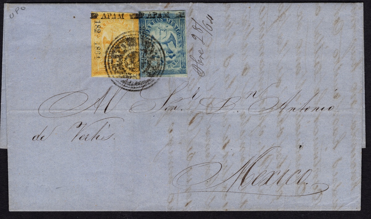 141   imageMexico. 1864 "Eagles". Apam 1r. Blue (#228-1864) and 2r. Yellow (#182-1864), both from the 3rd Period and with margins all around, tied to an entire letter from Apam to Mexico, dated December 1864. Only 200 of the 2r. Yellow were issued. Scott 21a, 23, $260 for singles off-cover. (Image)