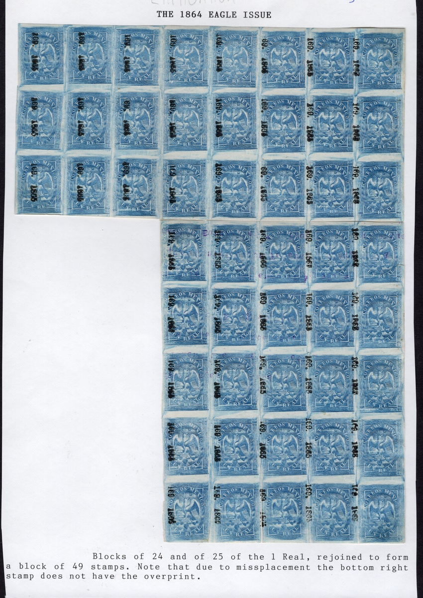 142   imageMexico. 1864 "Eagles". Chihuahua 1r. Blue (#169-1865), 4th Period, two large blocks of 24 and 25 stamps, rejoined to form a very large multiple of 49 units with original gum, with nearly all stamps n.h. Just one thin spot in one of the multiples. A spectacular exhibition item. Scott 21, $735 as hinged singles., , (Image)