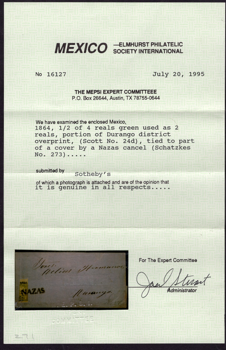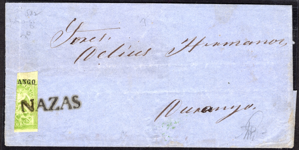 143   imageMexico. 1864 "Eagles". Durango 4r. Green, bisect on cover front, cancelled in the small town of Nazas with handstamp tying the franking, dated July 13, 1865. 1995 MEPSI certificate and signed J.K. Bash. Scott 24d, $700 on cover. (Image) (Image2) (All Images)