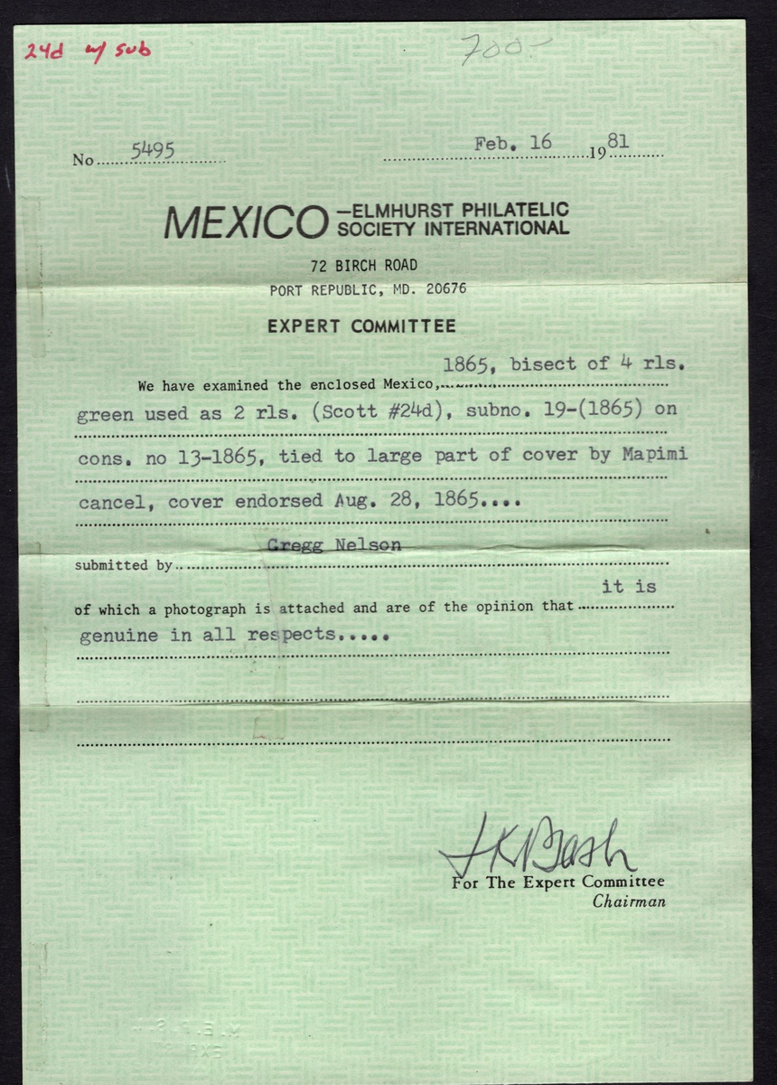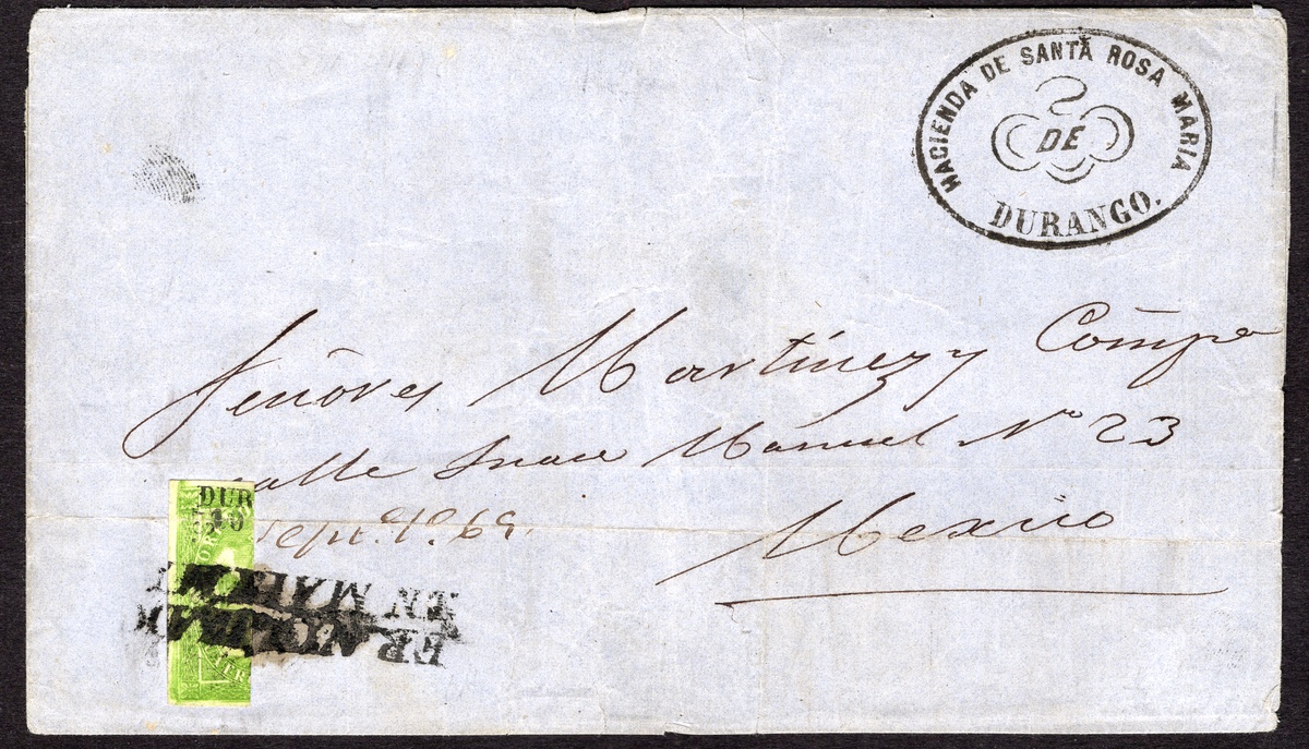 144   imageMexico. 1864 "Eagles". Durango 4r. Green, 4th Period (#13-1865, sub 19), bisect on aged cover, tied by a scarce handstamp from the small town of Mapimí, dated August 28, 1865. 1981 MEPSI certificate signed J.K. Bash. Scott 24d, $700 on cover. (Image) (Image2) (All Images)
