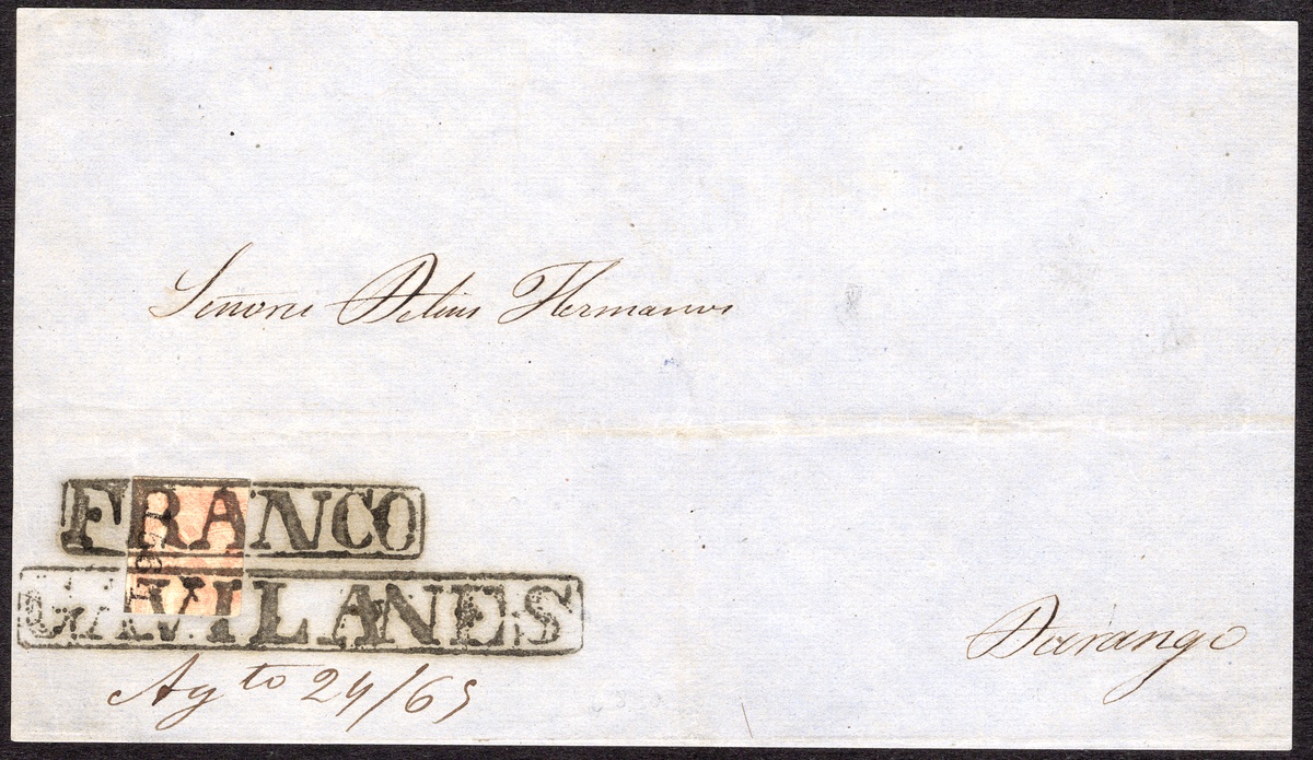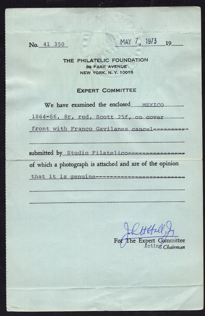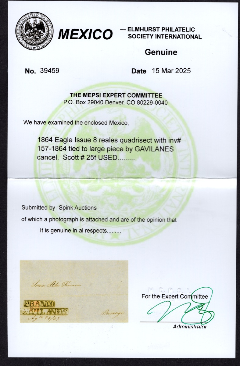 145   imageMexico. 1864 "Eagles". Durango 8r. Red, quadrisect on cover front with Gavilanes postmark dated August 24, 1865. A very rare item as splits were almost non-existent in this issue. Signed Bash with 1973 PF and 2025 MEPSI certificates. A quadrisect on cover was sold in SPINK in the December 2024 auction for $9,500 (lot #150). Scott 25f, $15,000 on cover. (Image) (Image2) (Image3) (All Images)