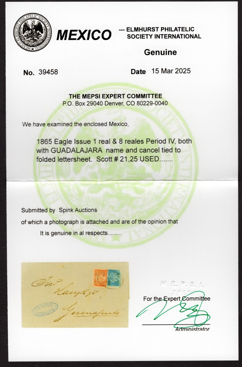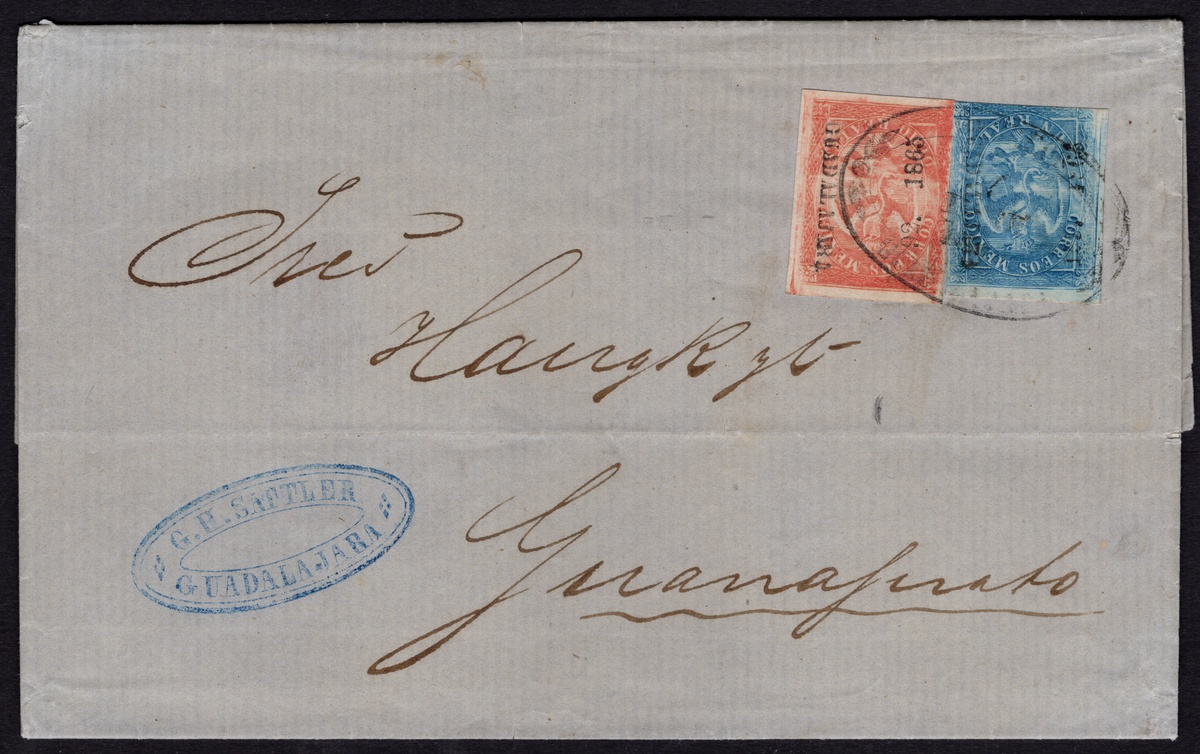 146   imageMexico. 1864 "Eagles". Guadalajara 1r. Blue (#155-65) and 8r. Red (#92-65) 4th period, on attractive entire letter to Guanajuato dated December 5, 1865, cancelled with oval h.s. Filing crease not affecting the stamps. Any 8r. on cover is scarce. 2025 MEPSI certificate. Scott 21, 25. (Image) (Image2) (All Images)