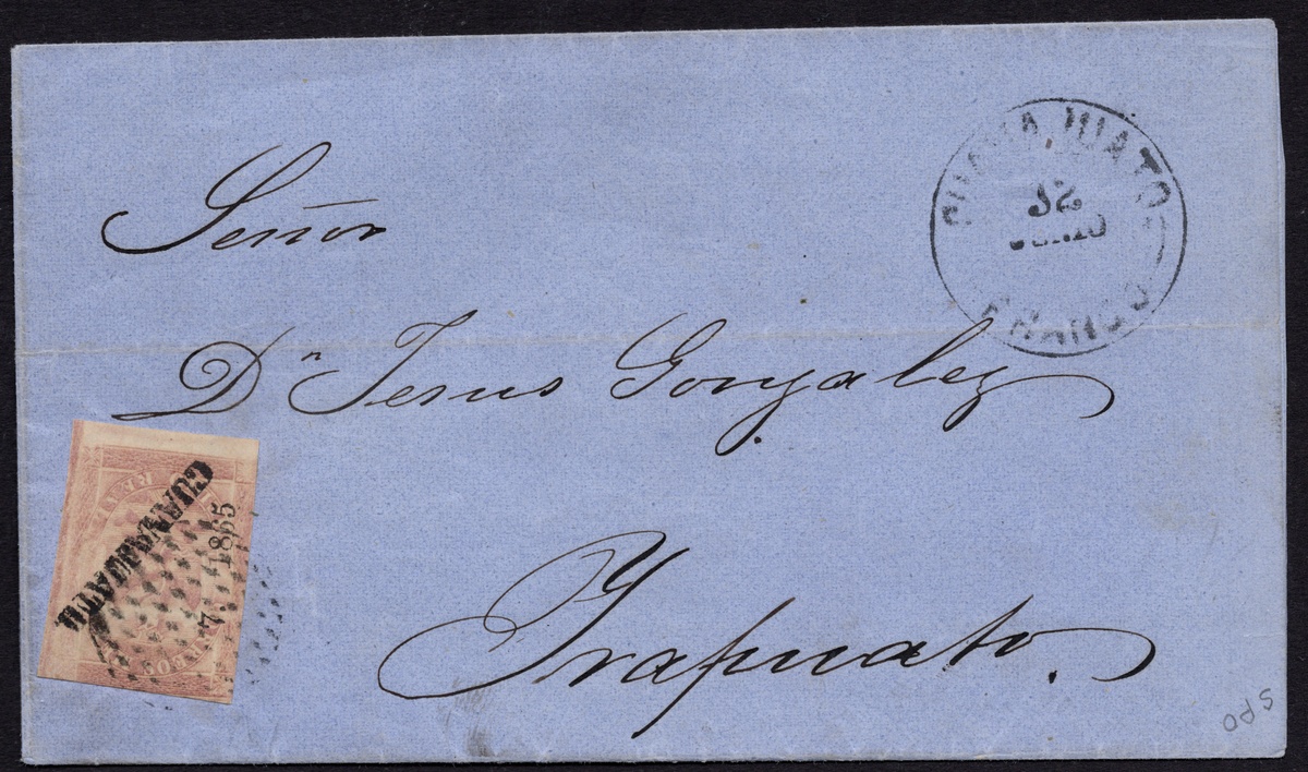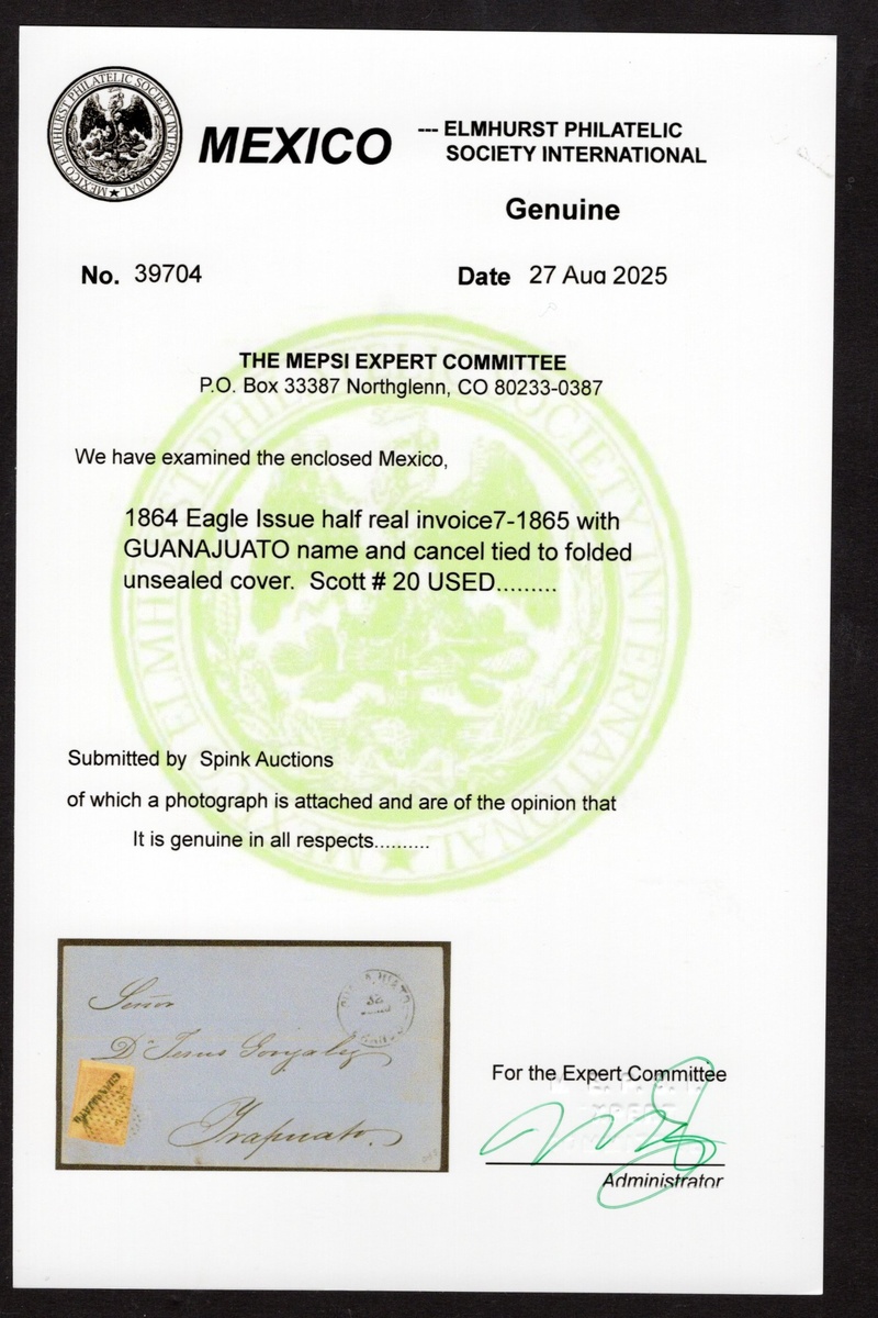 147   imageMexico. 1864 "Eagles". Guanajuato ½r. Reddish Lilac (7-1865), two good margins and cut slightly into on the other two sides, tied to cover dated June 12 with a manuscript letter inside. It only paid ½ r. so it was probably sent unseal to satisfy the printed matter rate. 2025 MEPSI certificate. Scott 20, $700. (Image) (Image2) (All Images)