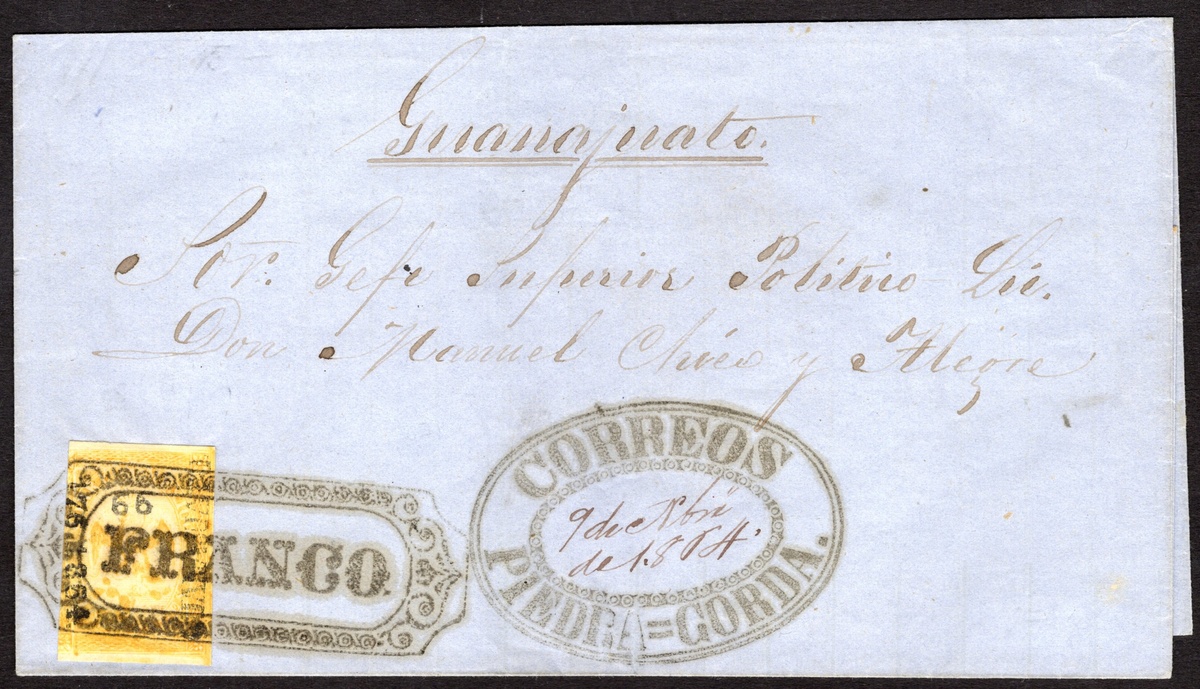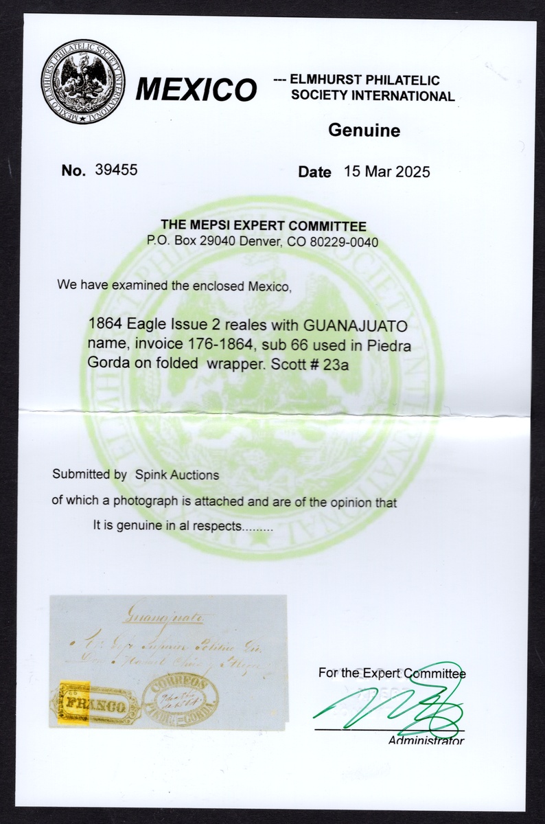 148   imageMexico. 1864 "Eagles". Guanajuato 2r. Yellow (#176-1864), 2nd period sub #66, on folded wrapper canceled with very rare and attractive Piedra Gorda handstamp. Dated November 9, 1864. This cancellation is believed to be unique on cover. 2025 MEPSI certificate. Scott 23a. (Image) (Image2) (All Images)