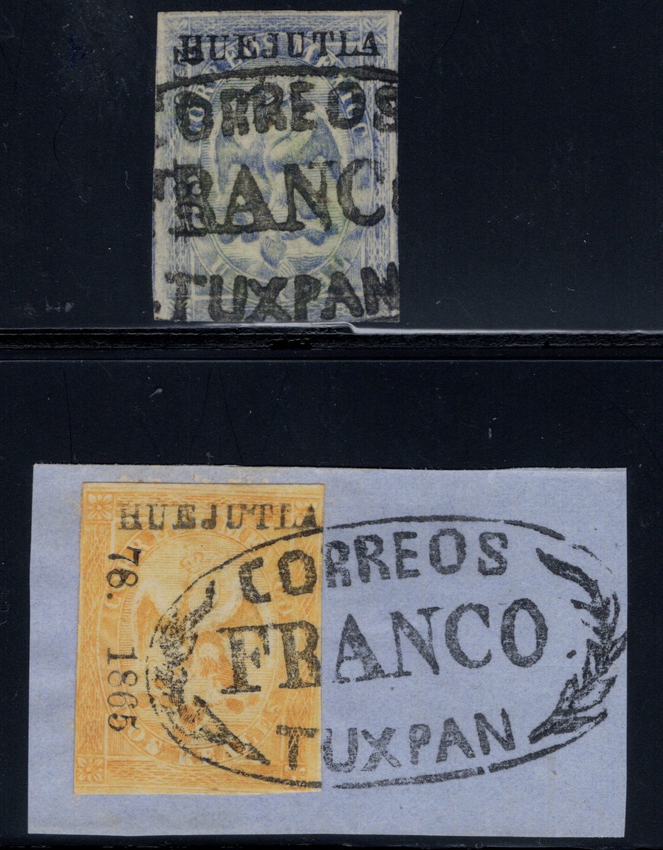 149   imageMexico. 1864 "Eagles". Huejutla Two very attractive stamps with well-struck Tuxpan cancels, including 1r. blue, 3rd Period (#216-1864), with three good margins and one just touched (only 200 issued), and 2r. yellow, 4th Period (#78-1865), on piece, with margins all around. Scott 21a, 23; NF $340. (Image)