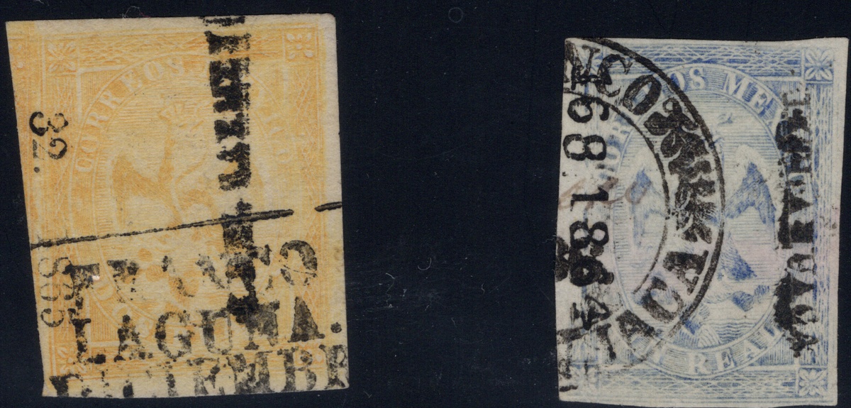150   imageMexico. 1864 "Eagles". Ixtlahuaca, Isla del Carmen Duo of very appealing examples: 1r. blue, 2nd Period (#168-1864), with margins all around, cancelled at Ixtlahuaca; although 300 were issued, a recent census records only five copies. Also 2r. yellow, 4th Period (#32-1865), with full margins including jumbo examples, cancelled at Laguna, scarce as only 353 were issued. Scott 22, 23; NF $650. (Image)