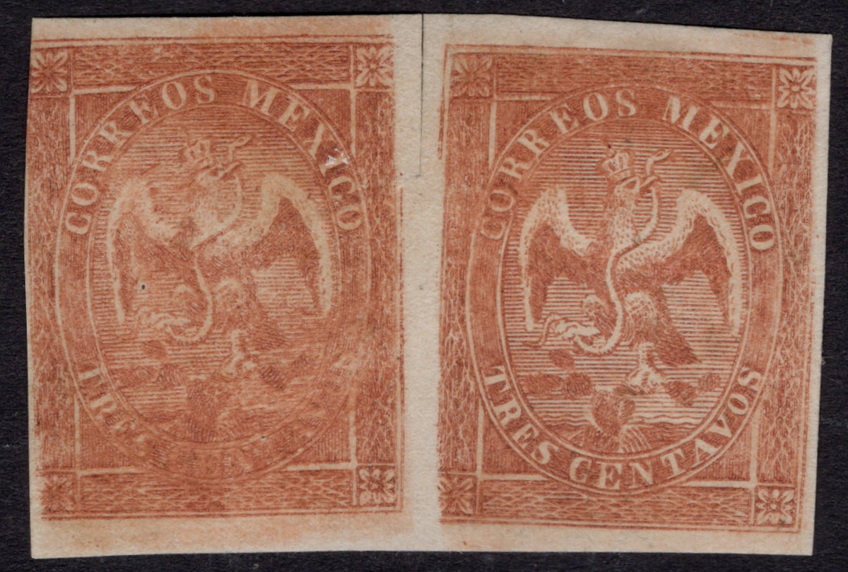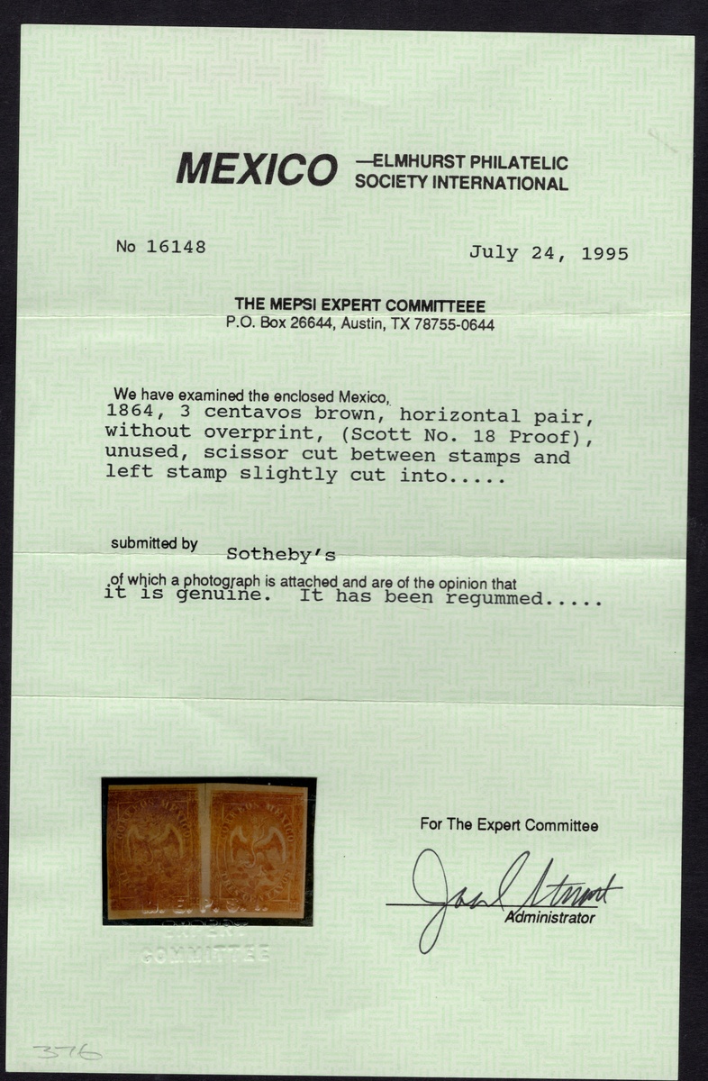 151 Proof   imageMexico. 1864 "Eagles". No Overprint Proof 3c. Brown, unoverprinted proof in very rare horizontal pair, just touched at left, otherwise displaying good to large margins. The pair shows strong color an is very fresh, with a small scissors cut between stamps. A showpiece of key significance for its rarity and its connection to the very limited issue of only 2,403 stamps which were produced for the local experiment for local city mail in Mexico City. To our knowledge, this is one of only two recorded pairs. 1995 MEPSI certificate, which notes that it has been regummed. Scott 18 var. (proof). (Image) (Image2) (All Images)