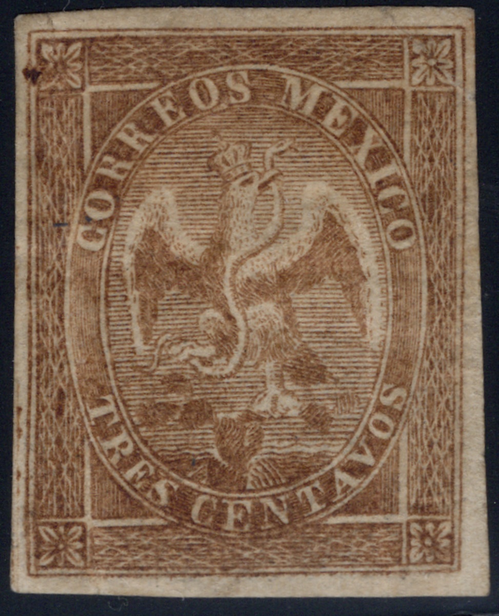 153   imageMexico. 1864 "Eagles". Mexico District 3c. Brown (#55-1866), fifth period, an unused example with large margins all around and fresh color. Small filled-in thin, nevertheless a great looking stamp. Issued as an experiment for local city mail between 1866 and 1867, only 2,403 of these stamps were printed, including 300 from this consignment. 1999 MEPSI certificate. Scott 18, $1,300. (Image) (Image2) (All Images)