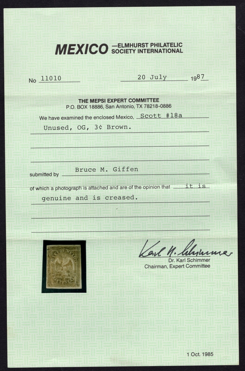 152   imageMexico. 1864 "Eagles". No Overprint 3c. Brown, unoverprinted and uncancelled, very good margins on all sides, with slight vertical creases. The unoverprinted examples of this experimental city post are also uncommon. 1987 MEPSI certificate. Scott 18a, $700. (Image) (Image2) (All Images)